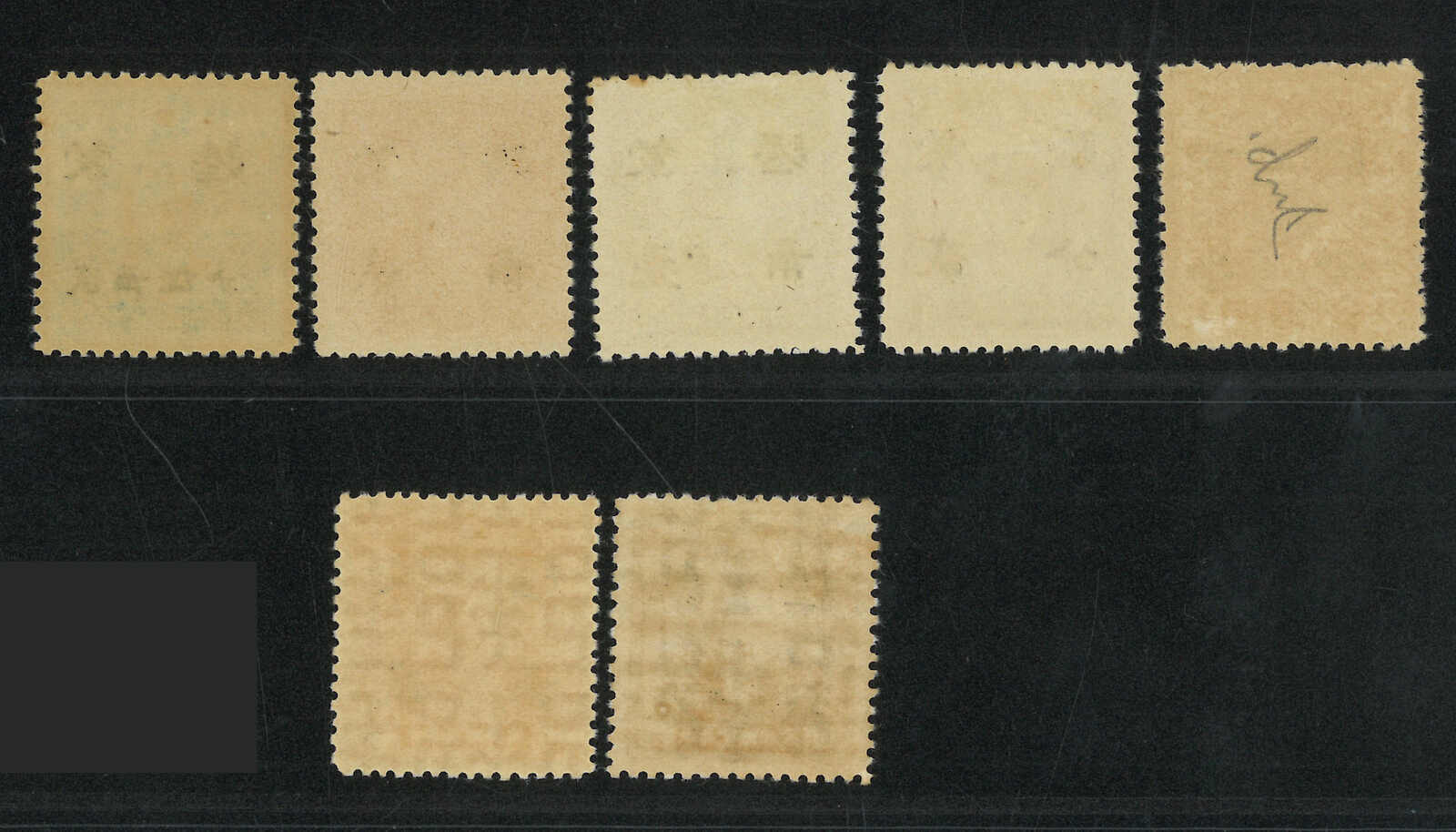 1942年日佔蒙疆加蓋半值票,蓋於大東版無水印及有水印孫像新全(陳目JM112-119),無貼/背貼上品。(Image 1)