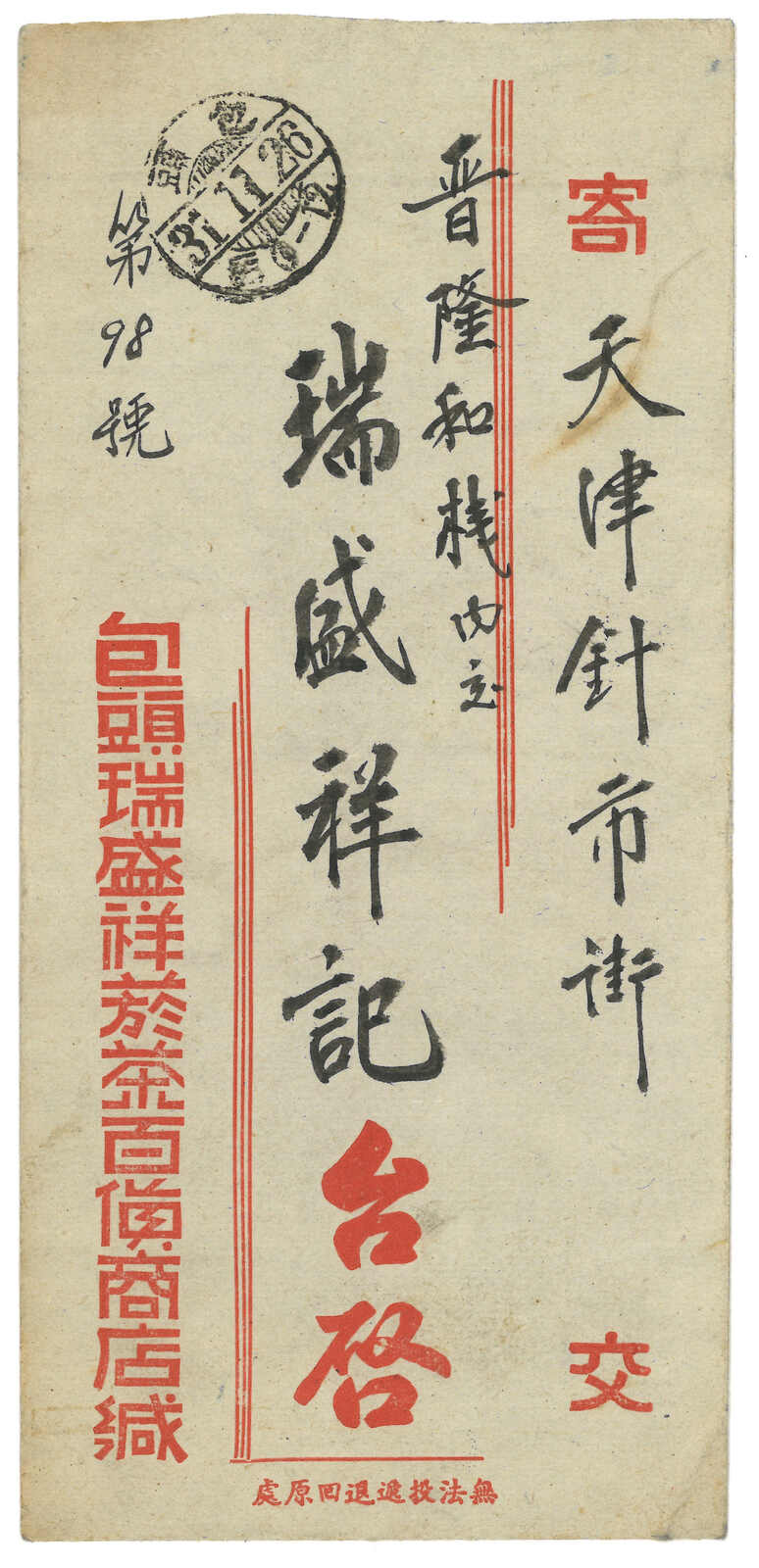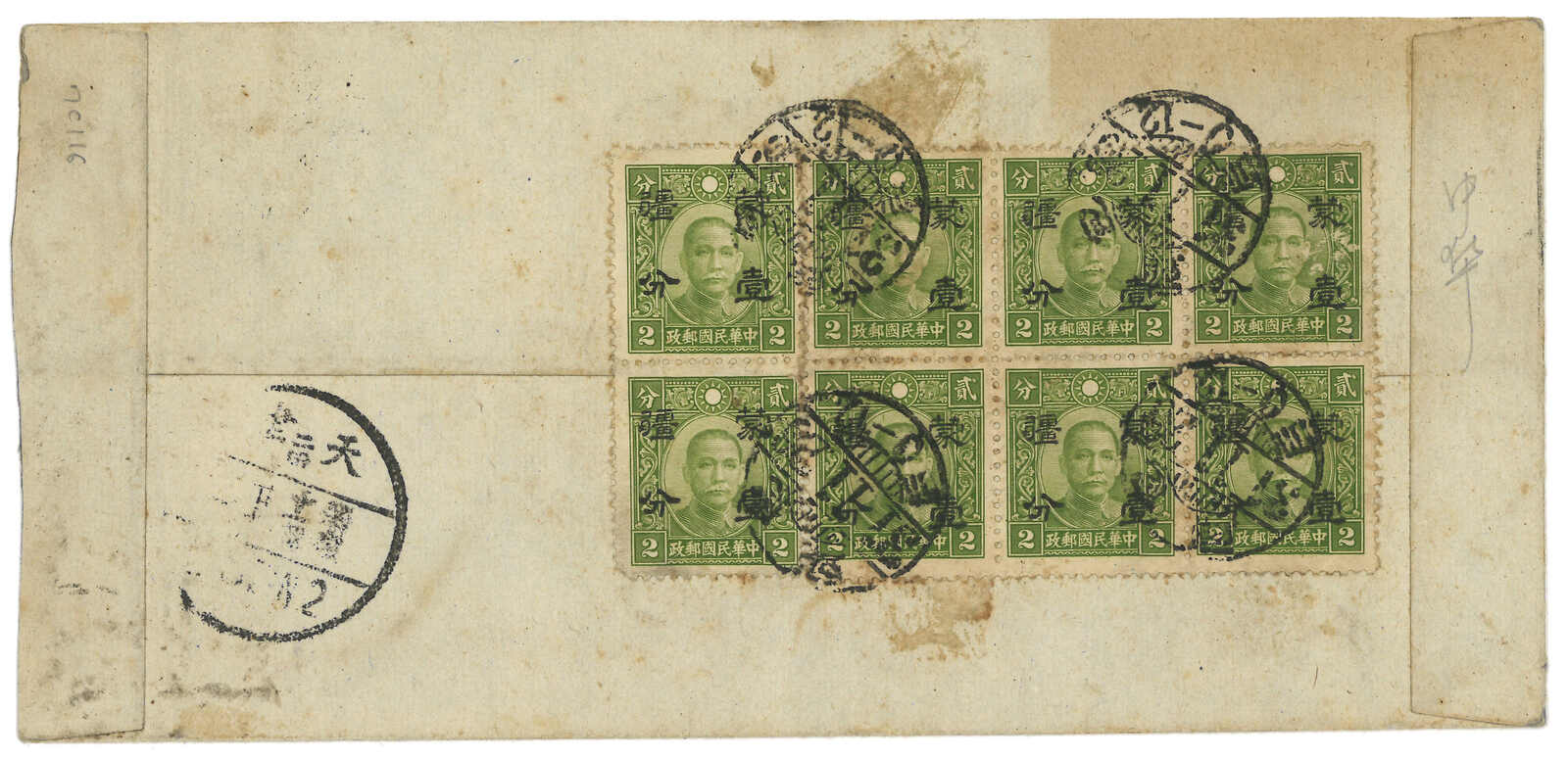 1942 Baotow (26 Nov) to Tientsin, f.w. Chunghwa Print SYS surch Mengkiang half value 1c/2c in block of 8 on reverse for domestic letter rate, tied by Baotow Japanese style cds. Arrived Tientsin.