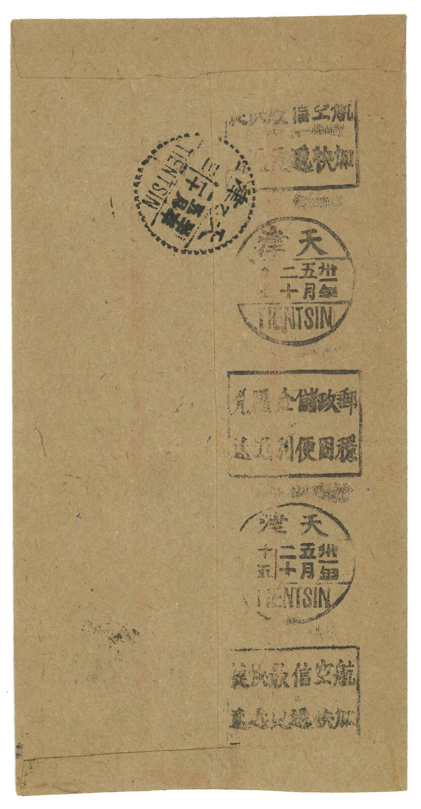 包頭寄天津,背貼中華版孫像加蓋蒙疆半值1分蓋2分八方連,合8分外埠郵資,銷包頭日式日戳。抵天津。(Image 1)