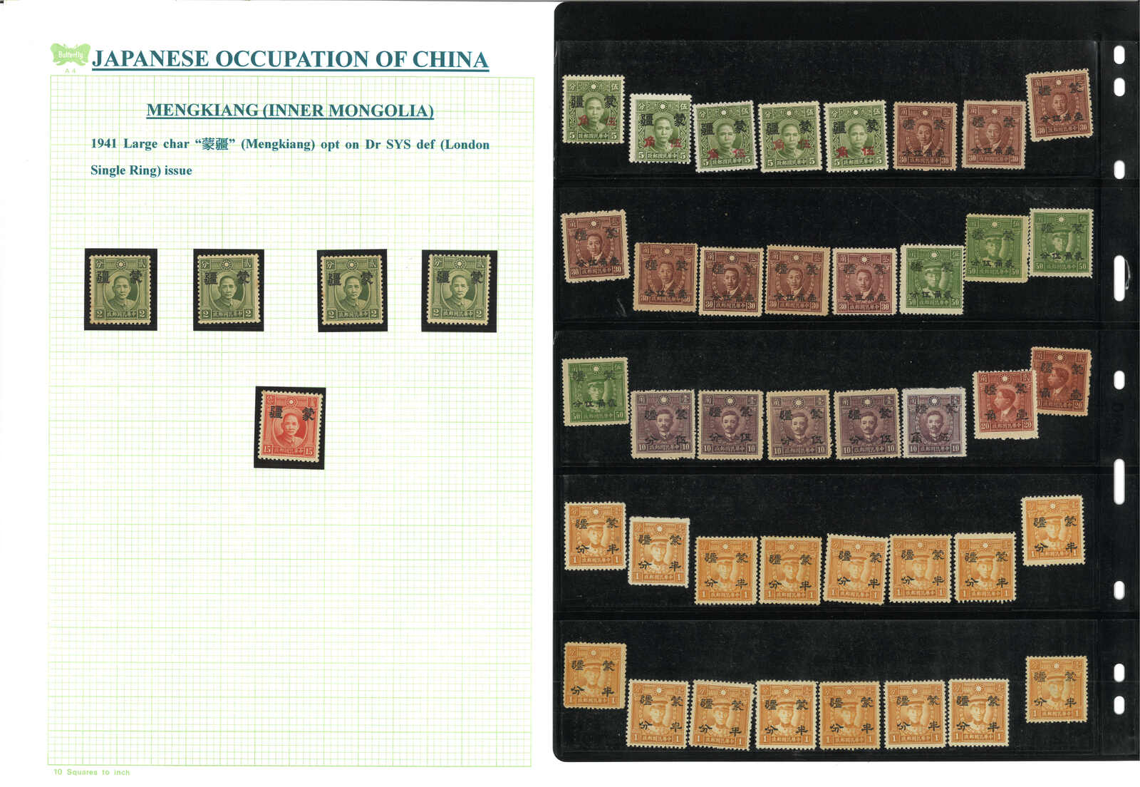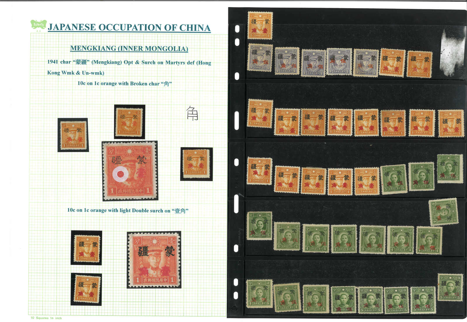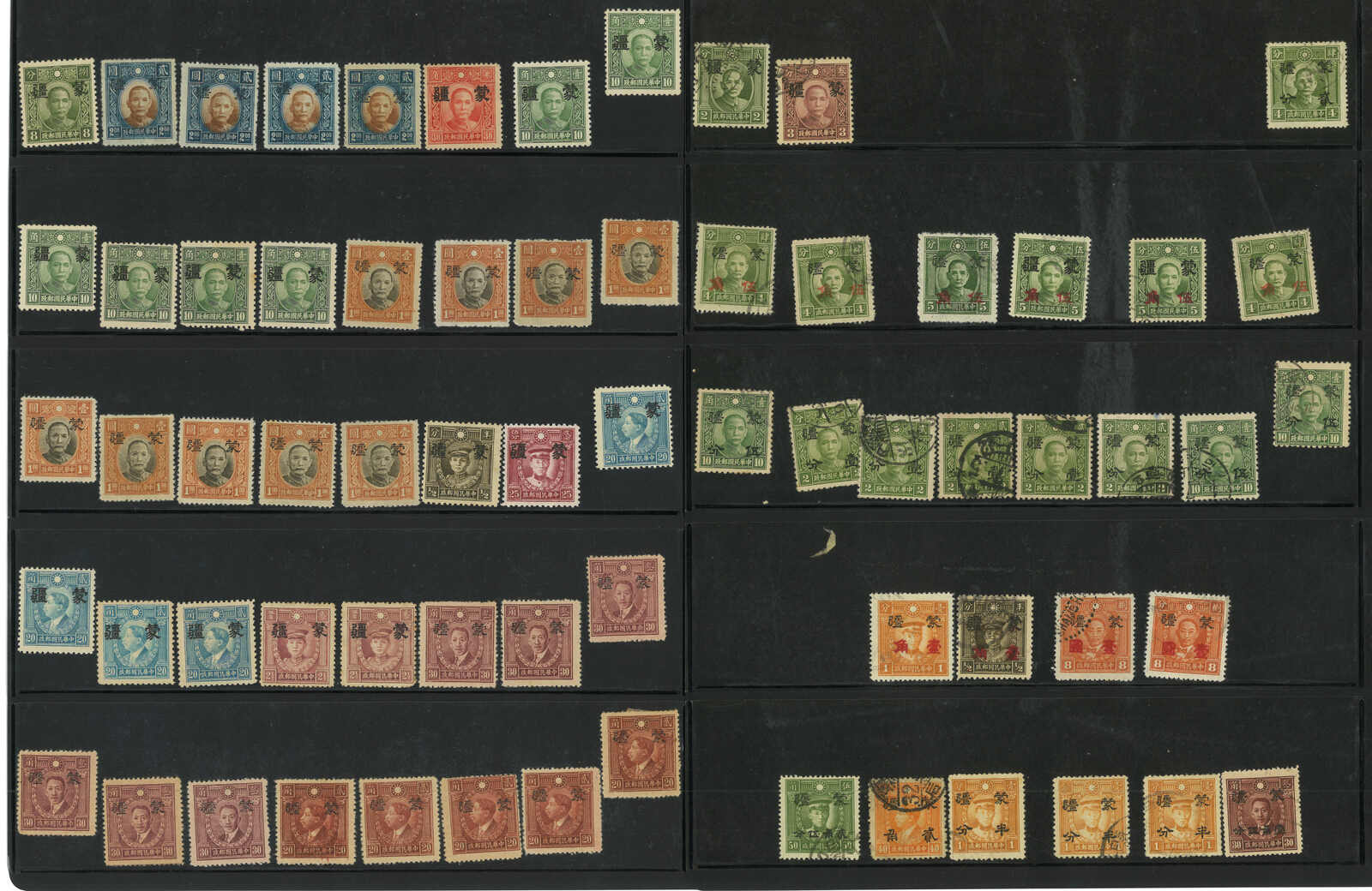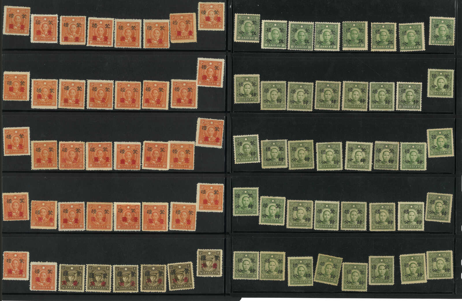 1941 a group of about 659 SYS and Martyrs ovpt. "Mengkiang", surch half value and resurch on ovpt. "Mengkiang" issues, including mint and used stamps as well as dozens of variety stamps. Covering various printings of original