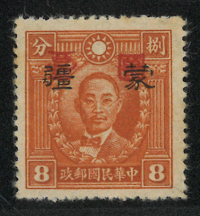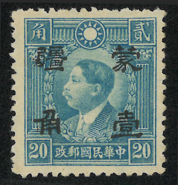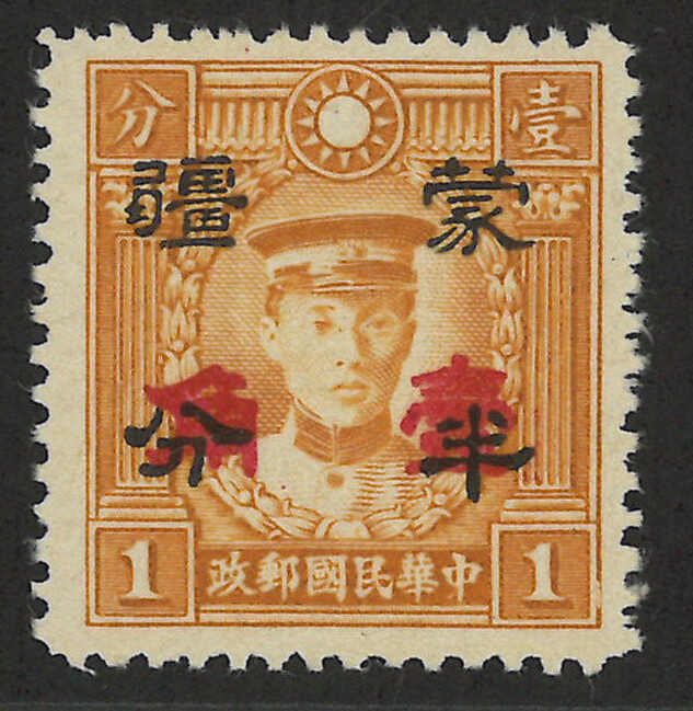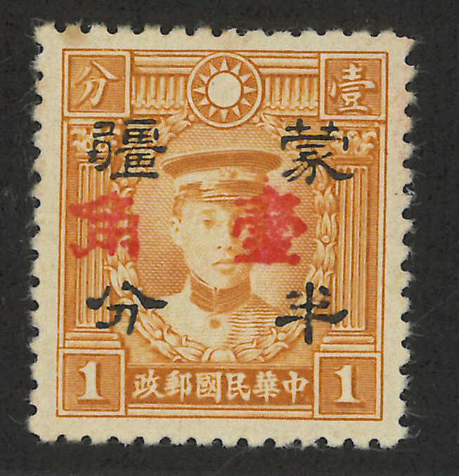 1945年日佔蒙疆改值壹角,蓋於蒙疆半值票烈士半分新﹐加蓋下移至與半分重疊(陳目JM198),無貼上品。稀罕難得。(Image 1)