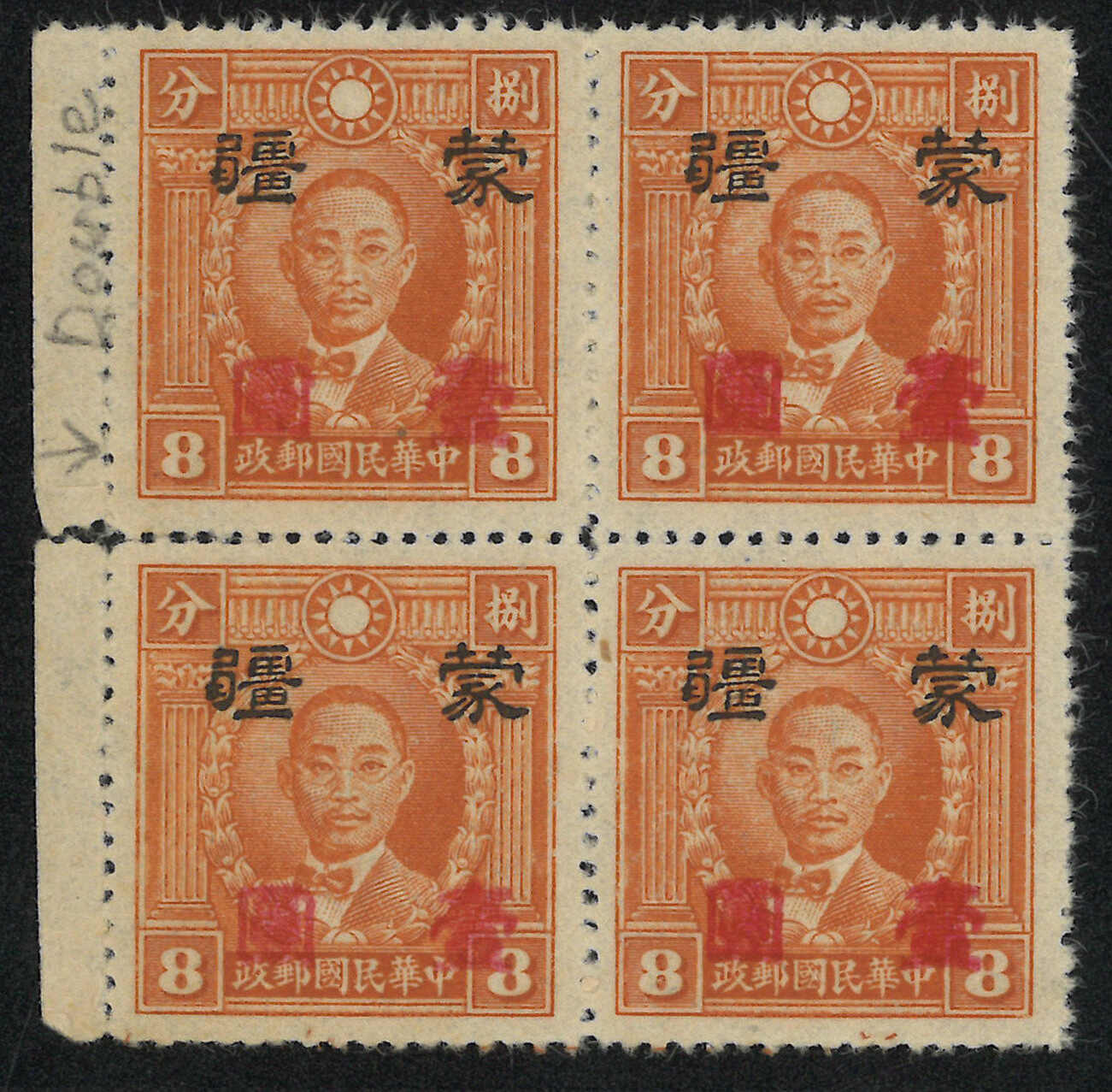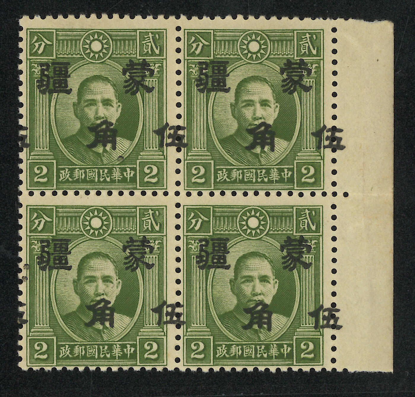 1945年倫敦版孫像2分加蓋大字“蒙疆”再改值5角四方連新,帶改值移位變異(陳目JM193),原膠無貼。(Image 1)