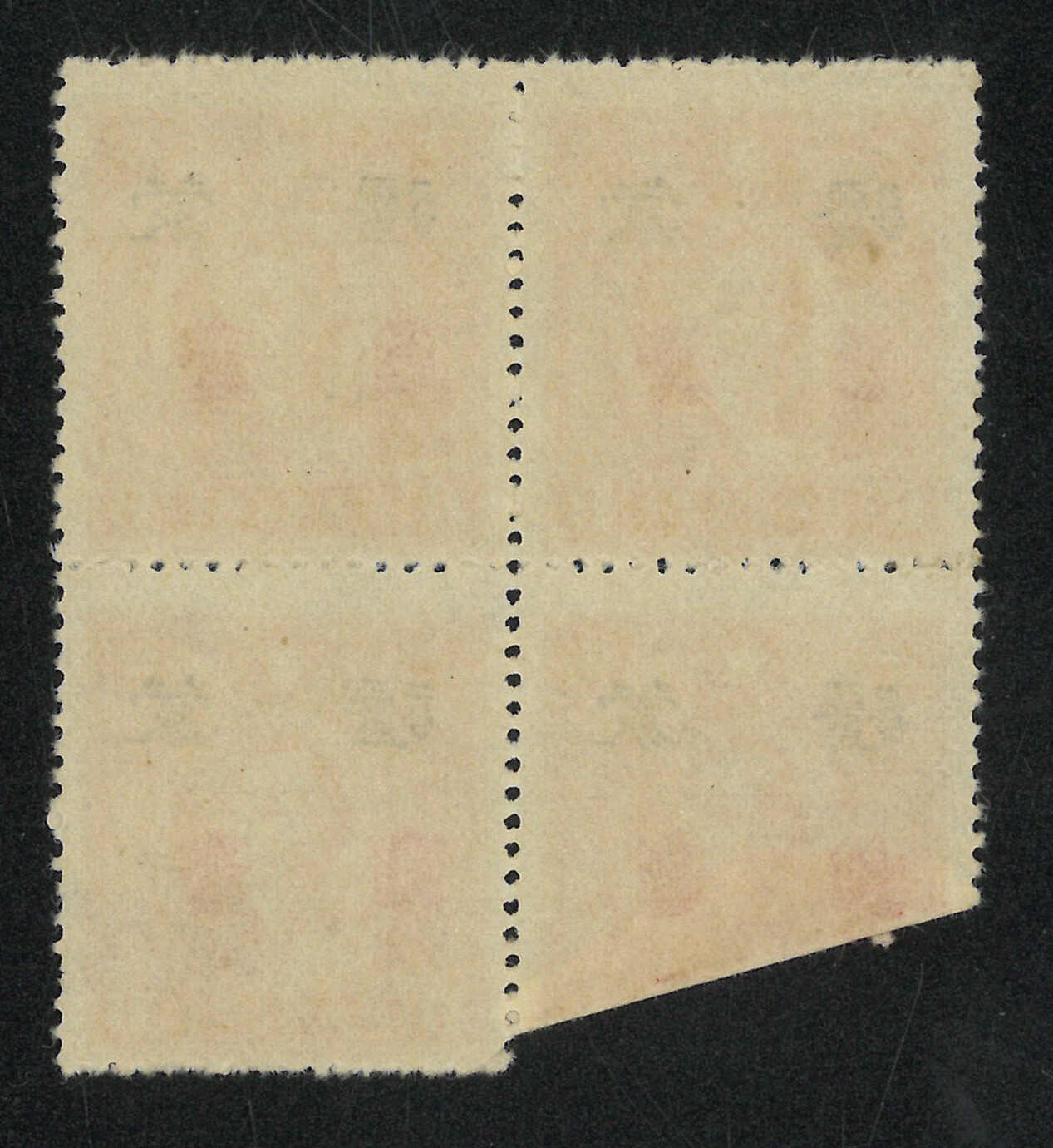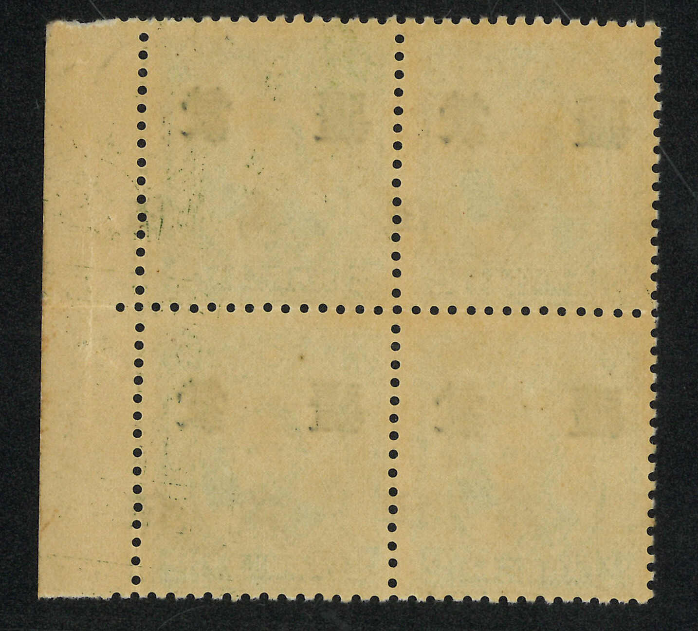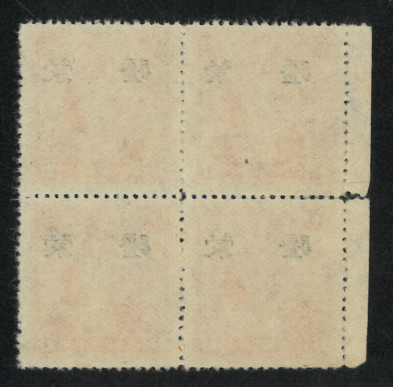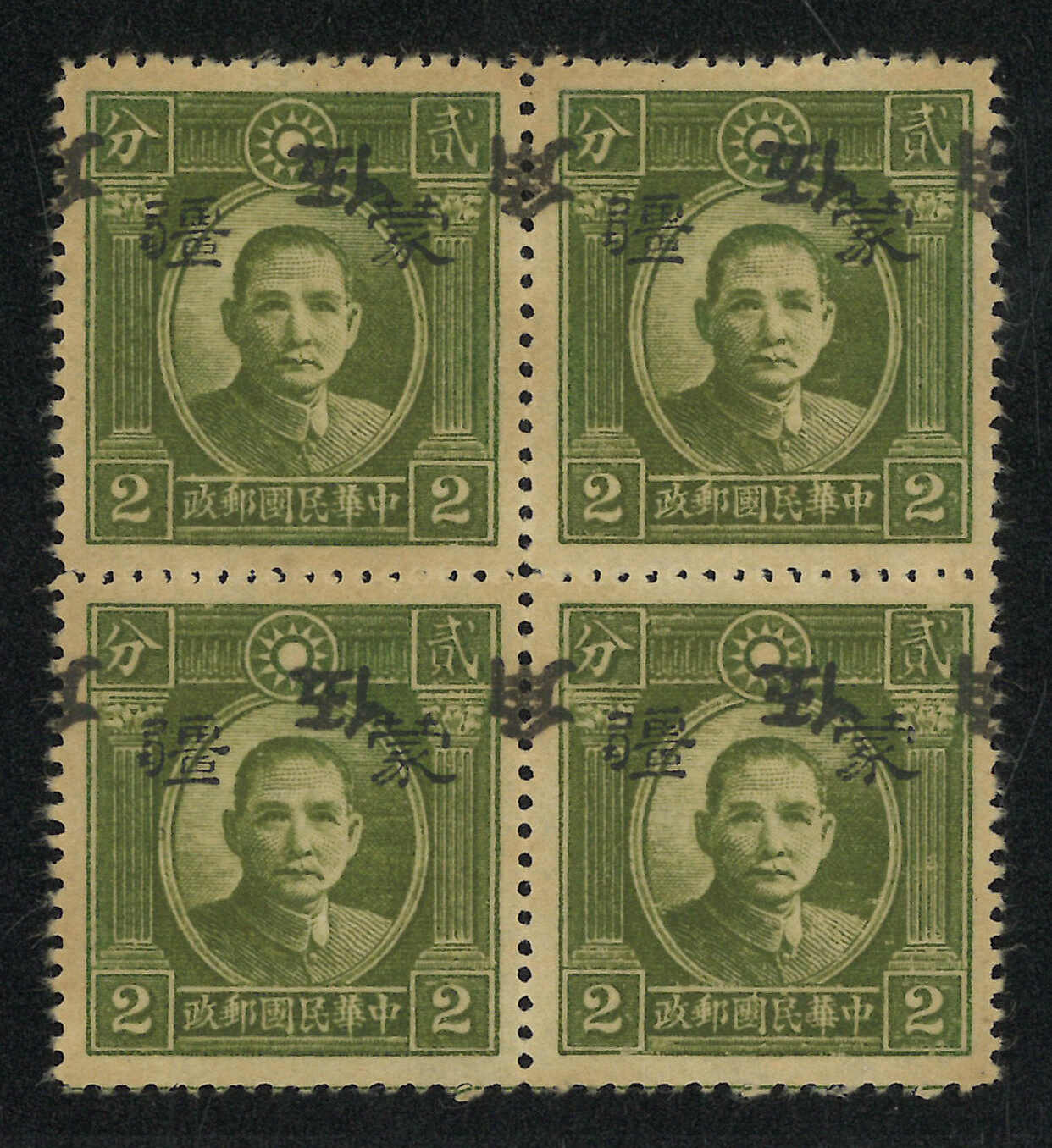 1945 Imitative Print SYS 2c ovpt. small figure “Mengkiang” and resurch 50c in block of 4, with inverted and shifted surch variety. MNH. Very Fine. Chan’s catalogue did not record this surcharge on imitative print SYS.