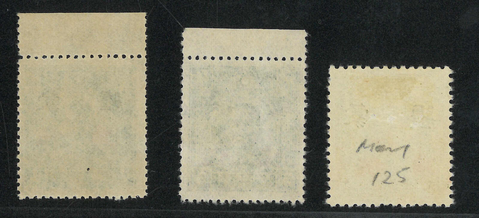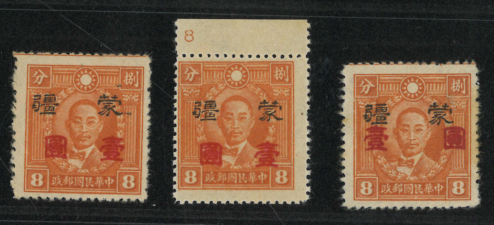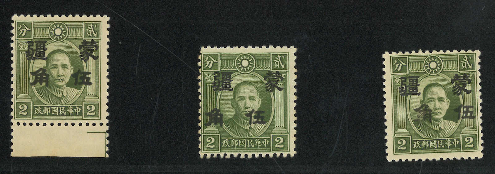 1945年倫敦版孫像2分加蓋大字“蒙疆”再改值5角正常票及變異票共三枚(陳目JM193),展示了改值移位變異。原膠無貼。(Image 1)