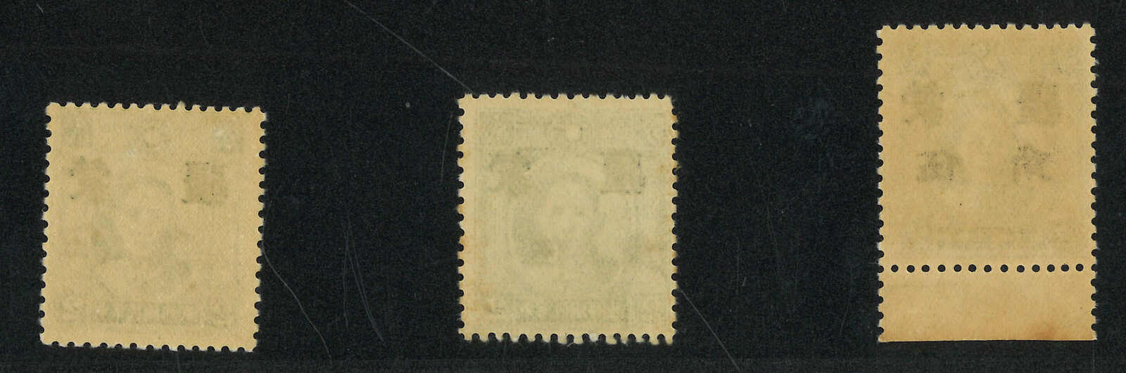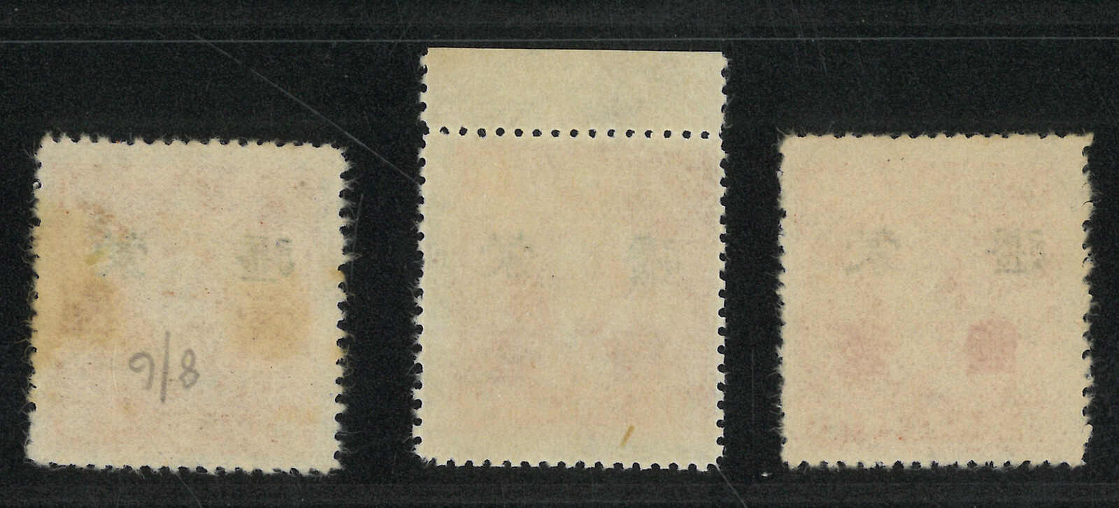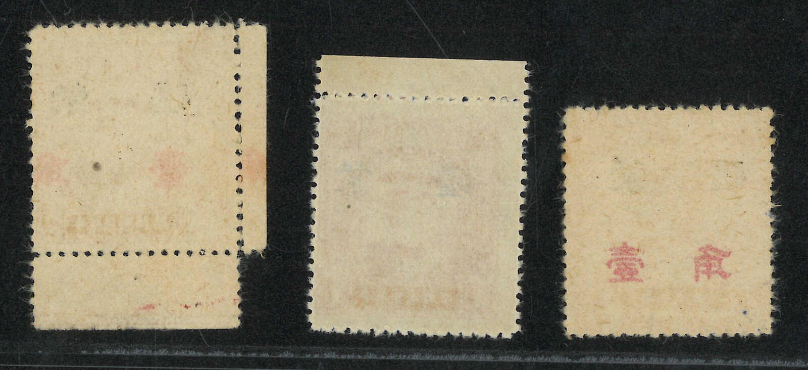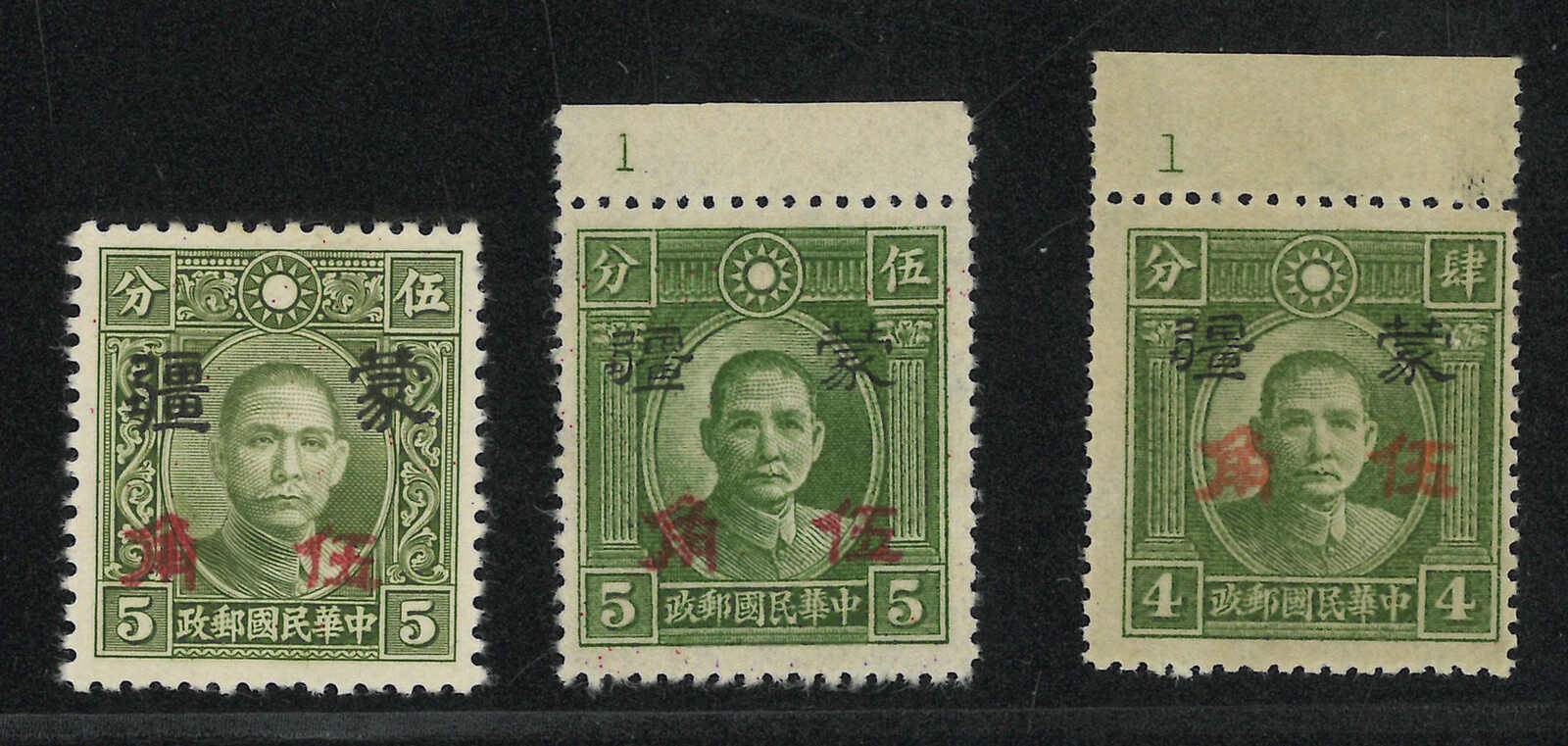1945年一組三件帶加蓋移位變異之蒙疆改值票,均為5角面值,蓋於仿版孫像4分、5分及中華版5分上。(Image 1)
