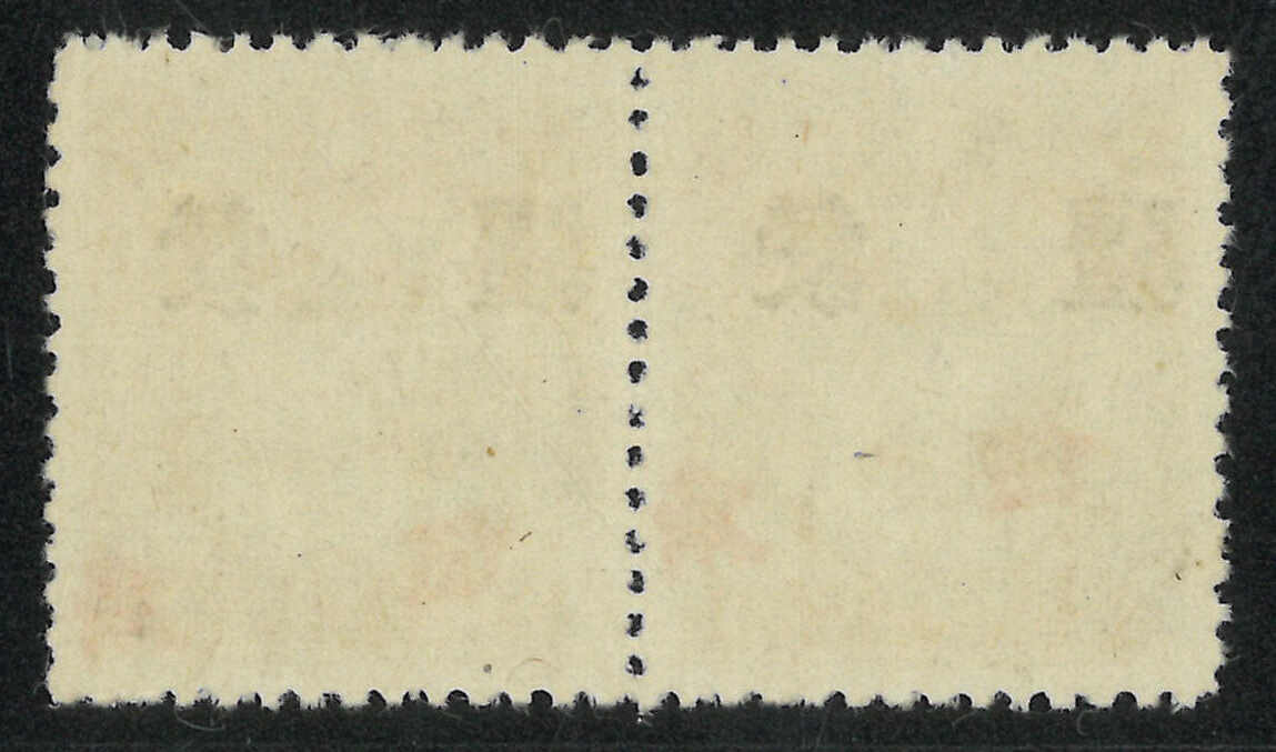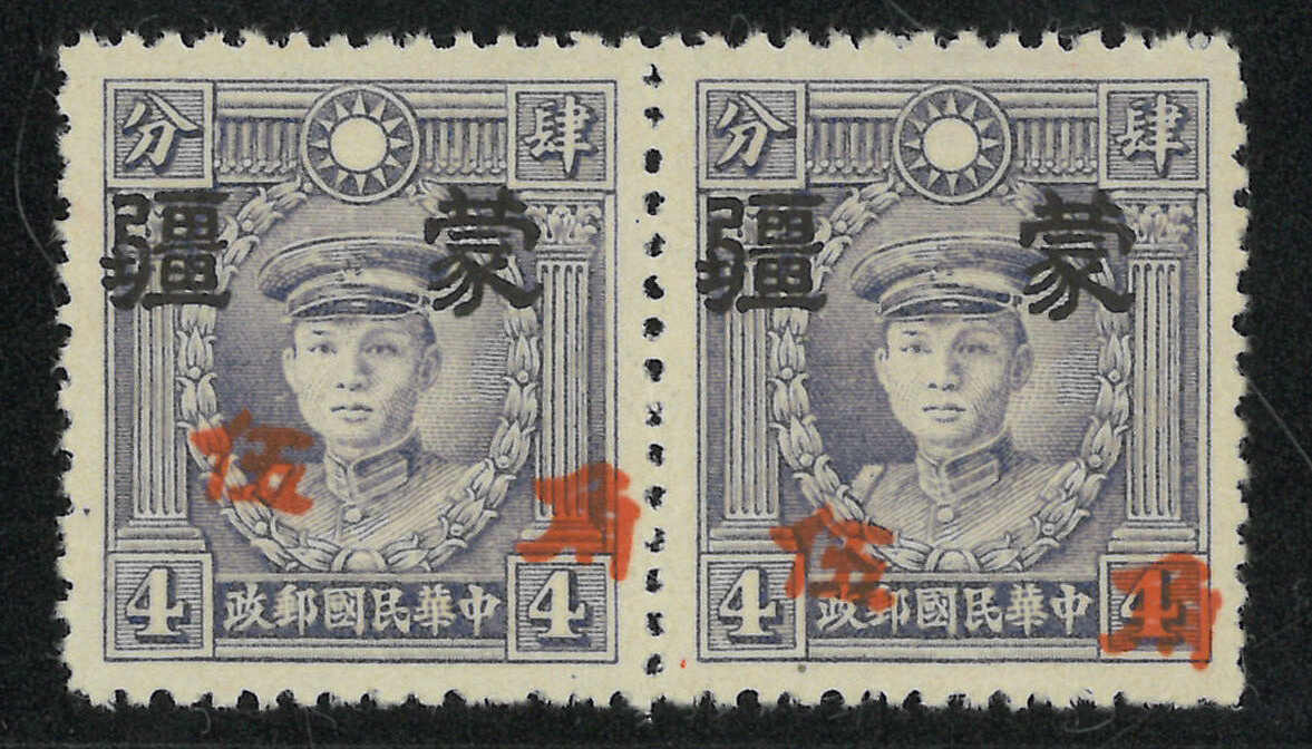 1945年香港版無水印烈士4分加蓋大字“蒙疆”再改值5角橫雙連新,帶加蓋移位兼“角伍”變異(陳目JM195),無貼上品。(Image 1)