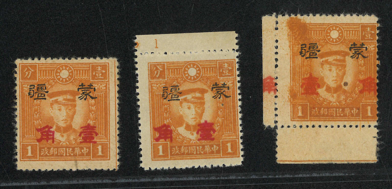1945年仿北京版烈士1分加蓋“蒙疆”再改值1角正常票及變異票共3枚(陳目JM200),帶改值移位及複蓋變異。無貼上品。(Image 1)