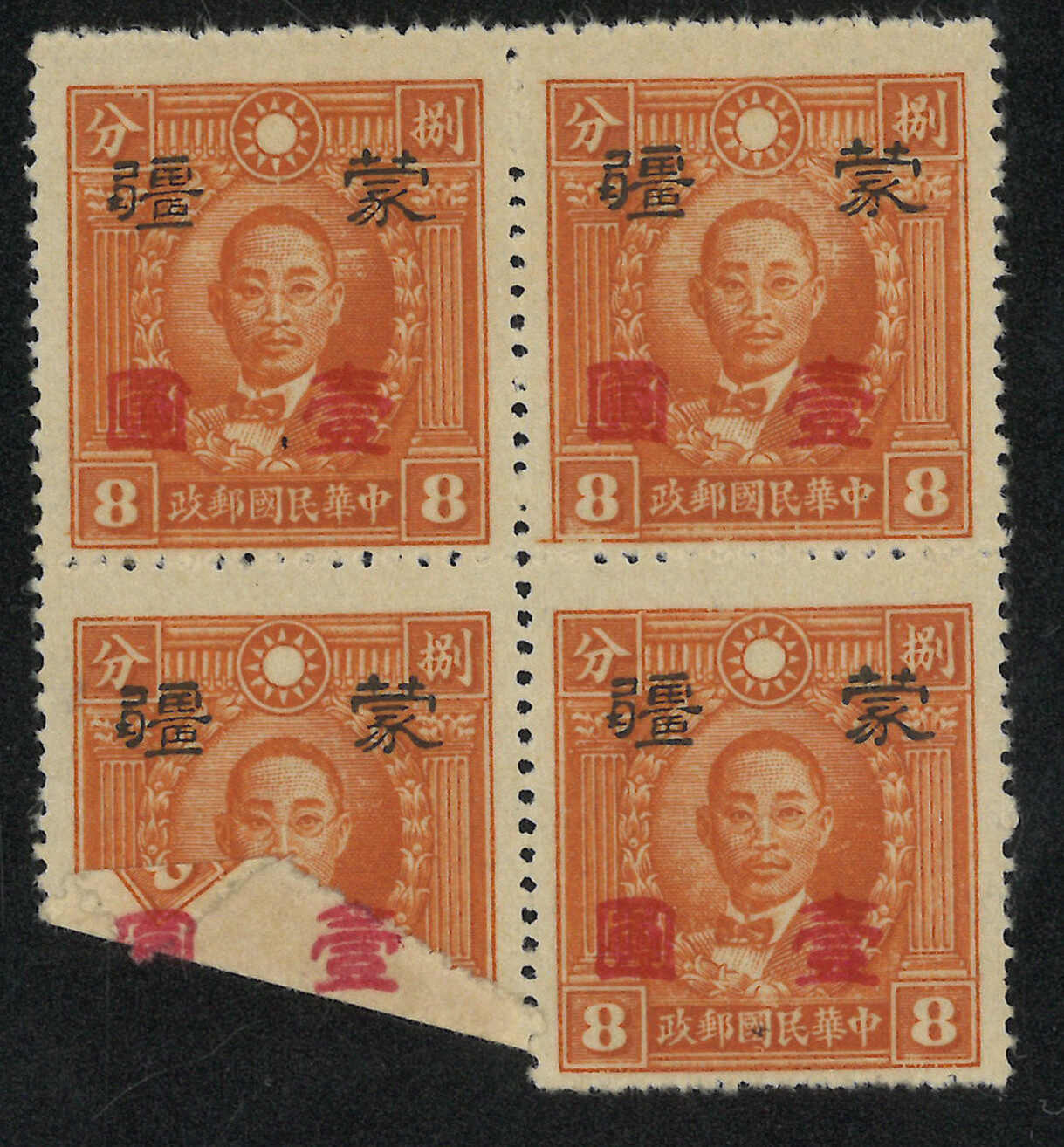 1945年仿北京版烈士8分加蓋“蒙疆”再改值1元四方連新,帶折白變異(陳目JM204)。無貼上品。(Image 1)