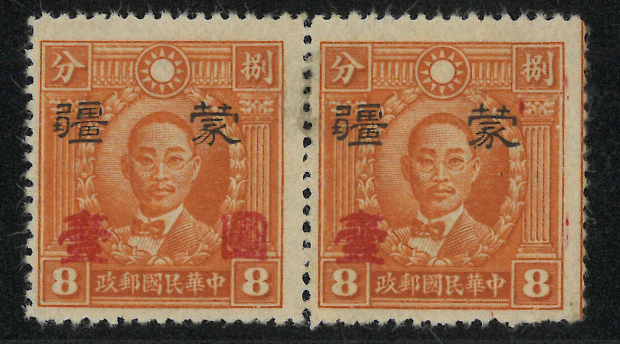 1945 Imitative Peking Print Martyrs 8c ovpt. Mengkiang and re-surch $1 in horizontal pair, with surch character missing and misplaced variety (Chan JM204), MNH. Very Fine.