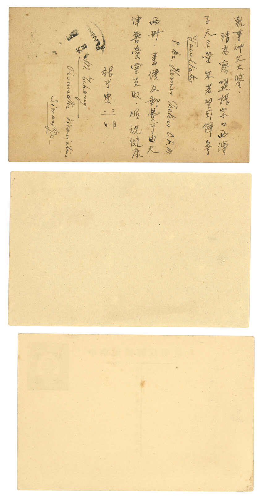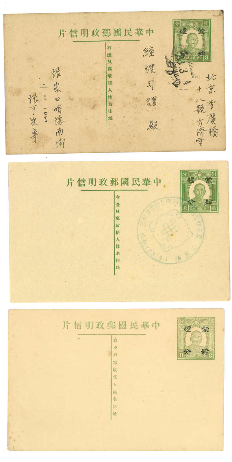 1940年代一組三件中華郵政孫像8分改值蒙疆4分郵資片,一件新、一件銷紀念戳、一件自張家口實寄。(Image 1)