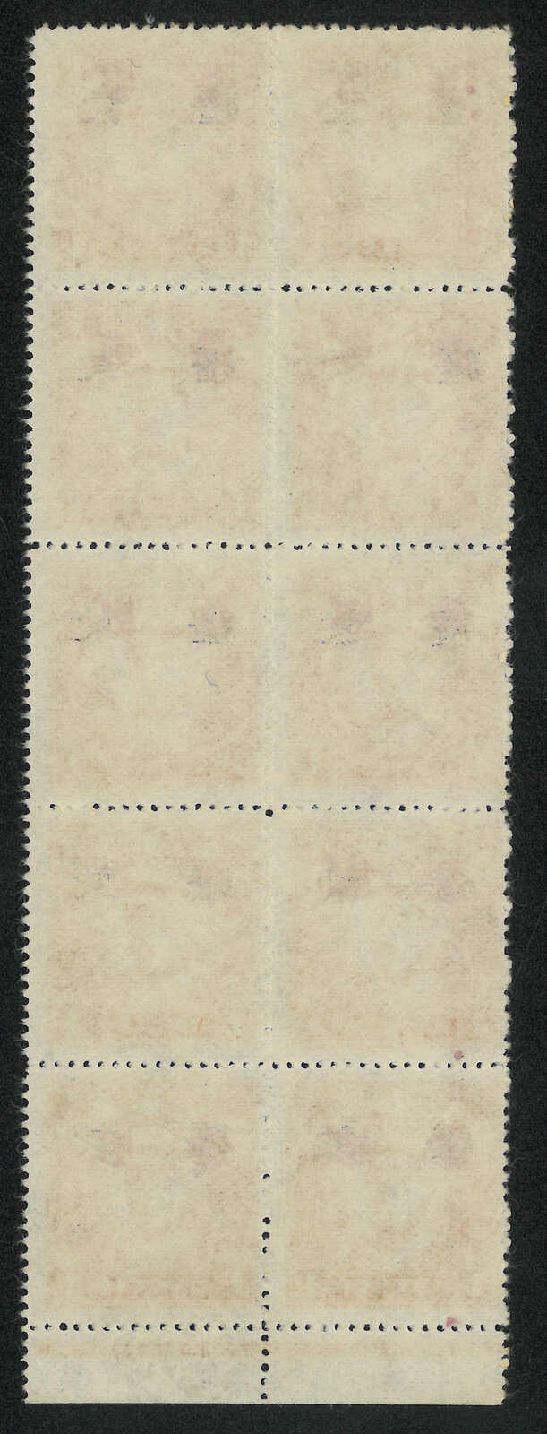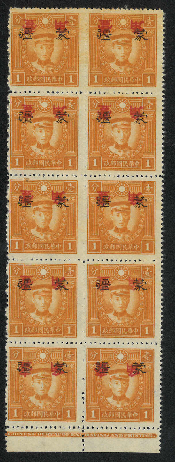 1945 Imitative Peking Print Martyrs 1c ovpt. Mengkiang and resurch 10c in block of 10, with surch inverted and shifted upward variety (Chan JM200), MNH without gum as issued.