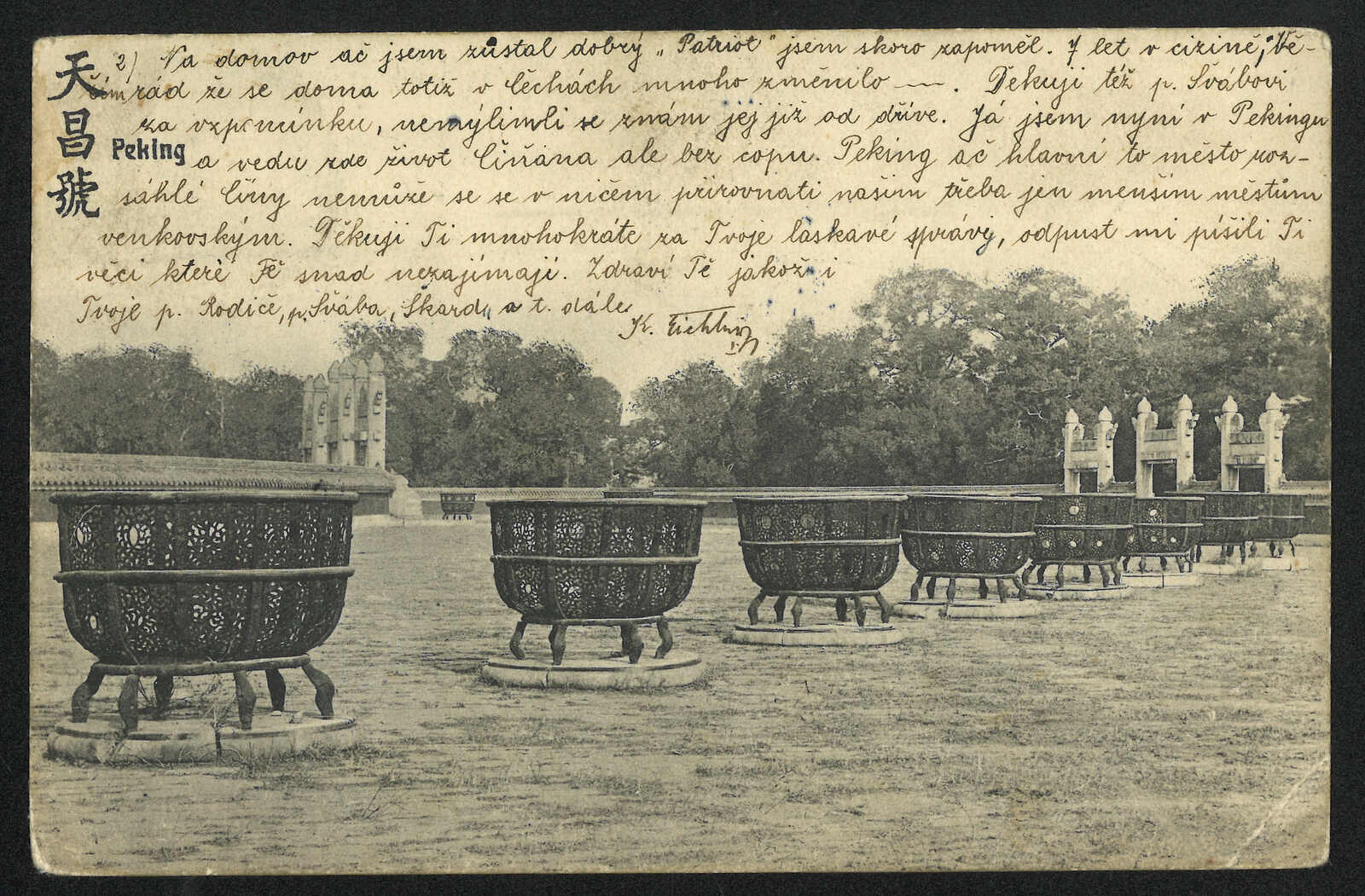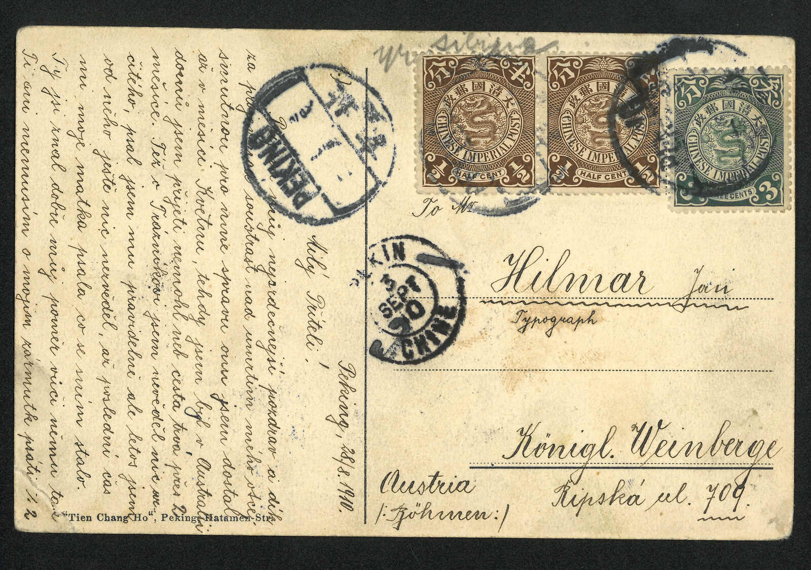 1910年天壇圖片明信片,自北京寄奧國,貼蟠龍3分 + 半分雙連,銷北京腰框英漢日戳。9.3經北京法局。天壇圖片明信片實寄,十分出色。(Image 1)