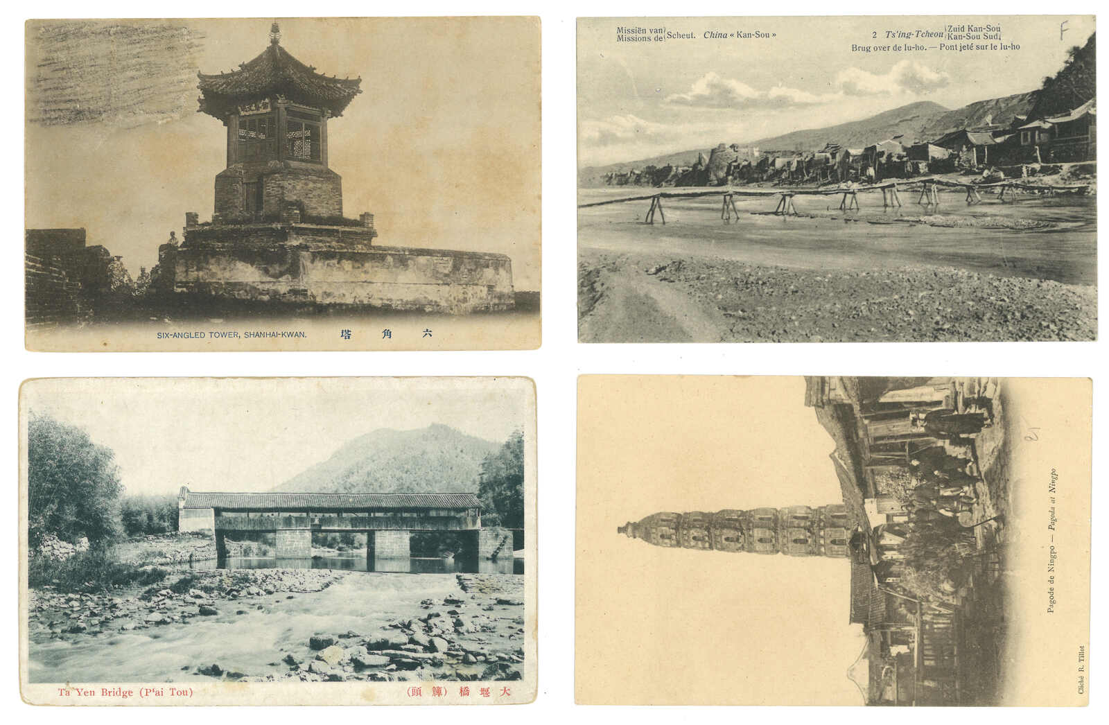 一組十二件中國風光明信片,展示了廟宇、寶塔、騎馬官員、橋樑等,大多未使用。(Image 1)
