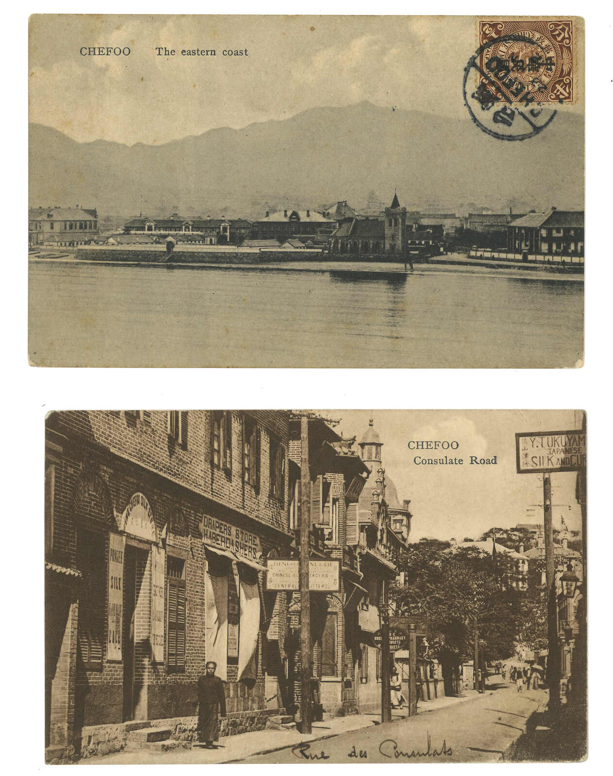 A group of 6 Chefoo view picture postcards, partly commerically used, with french ovpt. FM stamp or Chefoo Russian PO cds.