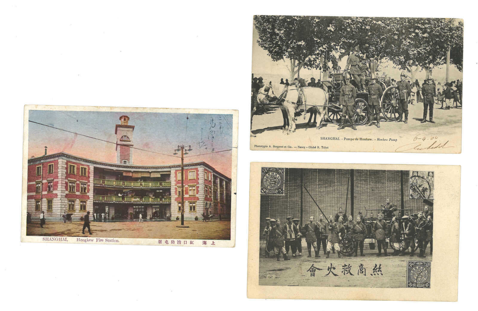 A group of 3 Shanaghai fire serivce picture postcards, two commerically used. Interesting theme.