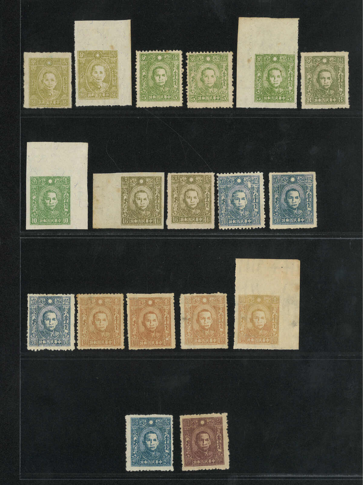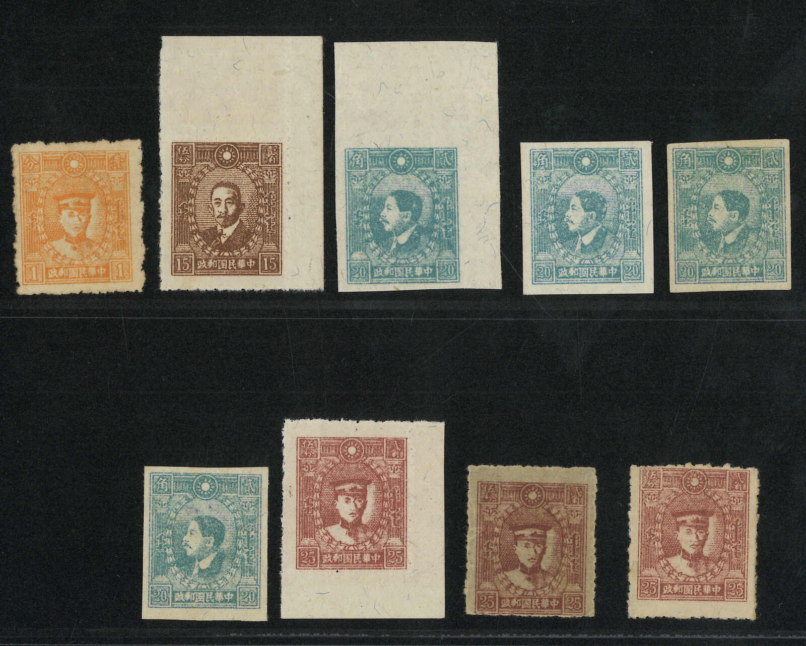 1945 unissued SYS and Martyrs Mongolian stamps in a group of 14, denominations from 2c to $20, including perf and imperf stamps.