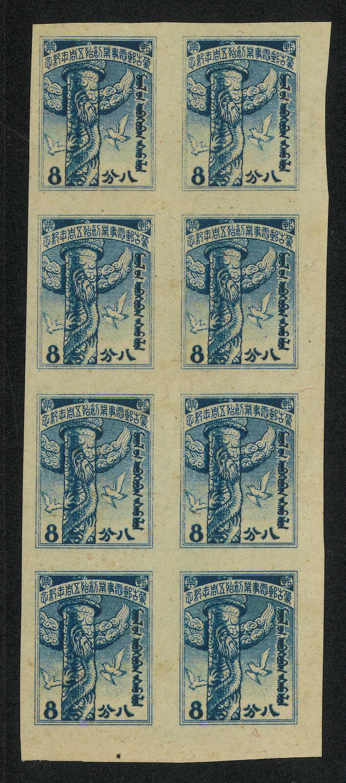 1943 5th Anniv of Mengkiang Postal and Telegraphic Service 8f in imperf block of 8 (Chan JM145). MNH without gum,