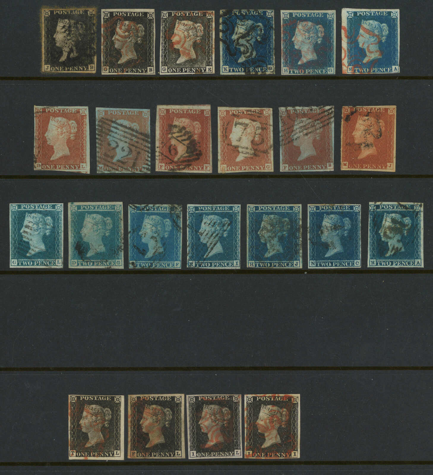 一組23枚英國黑便士、紅便士及藍便士新舊票,展示了不同版式。(Image 1) (All Images)