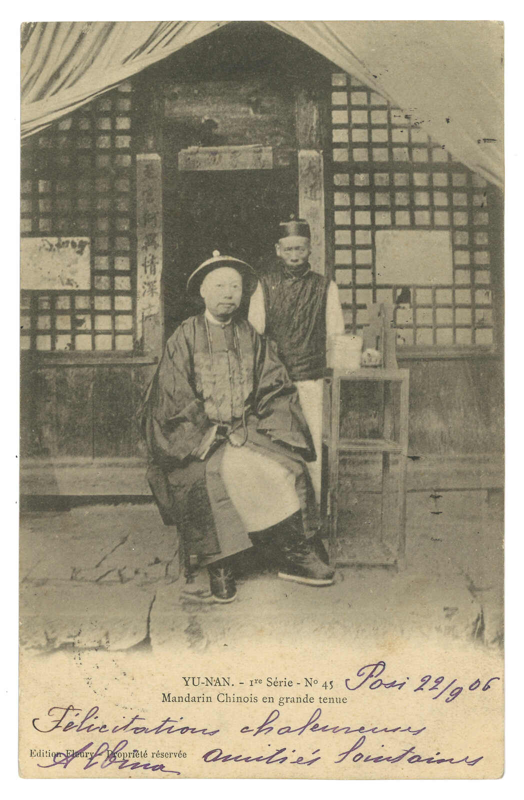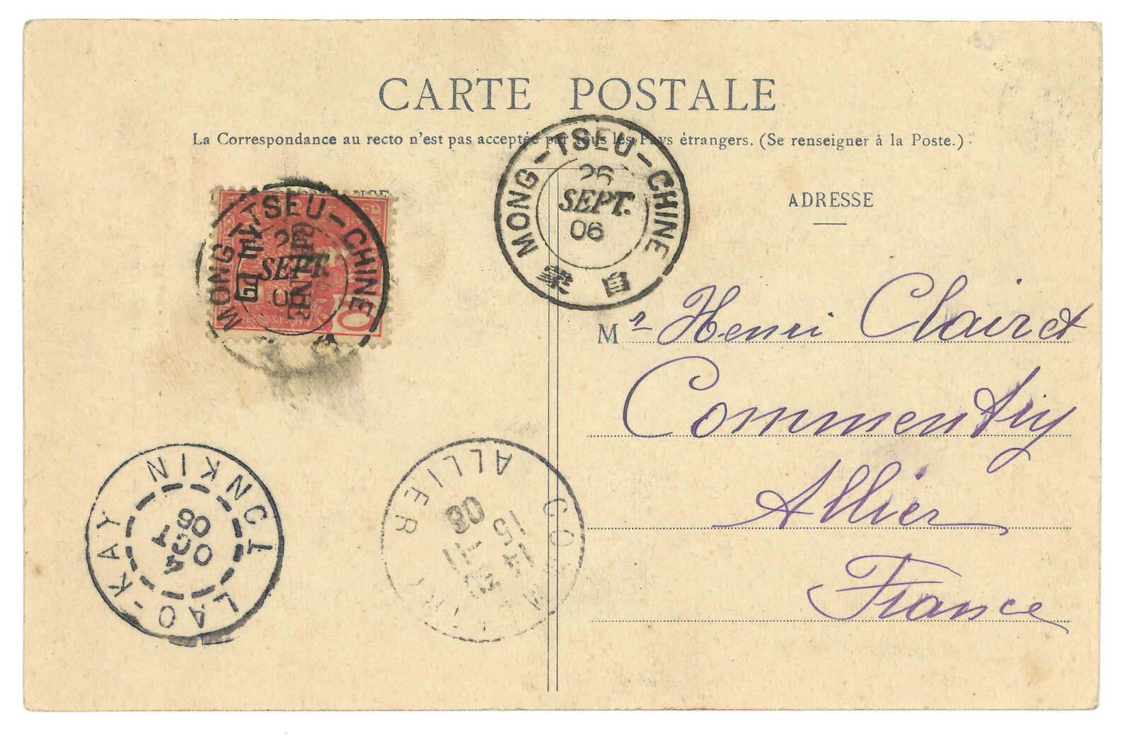 1906.9.26 蒙自寄法國。圖片明信片,貼法蘭西像加蓋CHINE四仙,銷蒙自法局日戳。10.4經老街。11.15抵法國。(Image 1) (Image 2)
