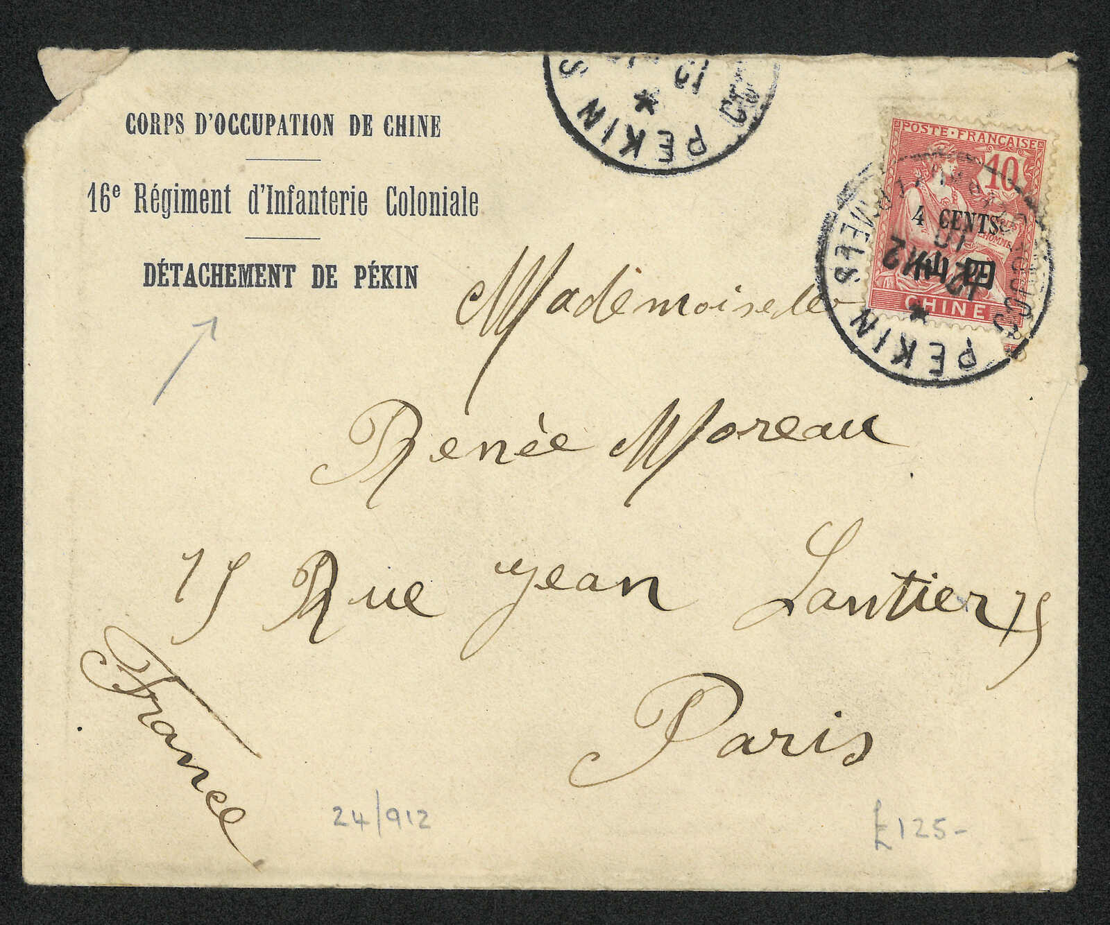 1910.12.12 法國在華佔領軍第十六步兵團北京分隊封,寄法國,貼普通票加蓋小字面值四仙,銷北京法國軍郵局日戳。(Image 1) (Image 2)