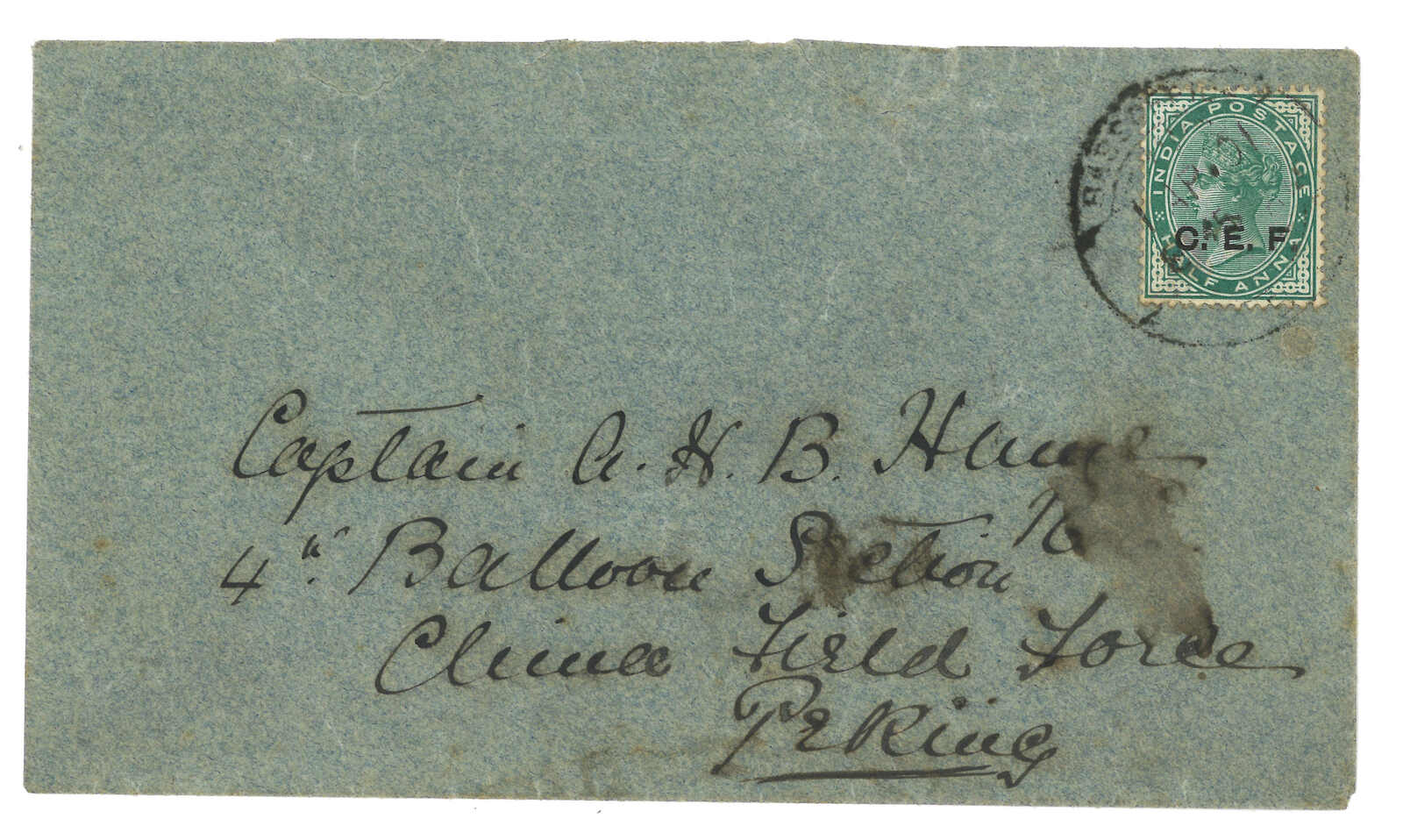 1901.4.1 天津基地郵局B寄北京氣球部隊Captain A.H.B. Hunce,貼印度維多利亞女皇像加 蓋C.E.F.半安娜,銷基地郵局日戳。4.1抵軍郵1局。稀罕難得之八國聯軍氣球部隊郵例。(Image 1) (Image 2)