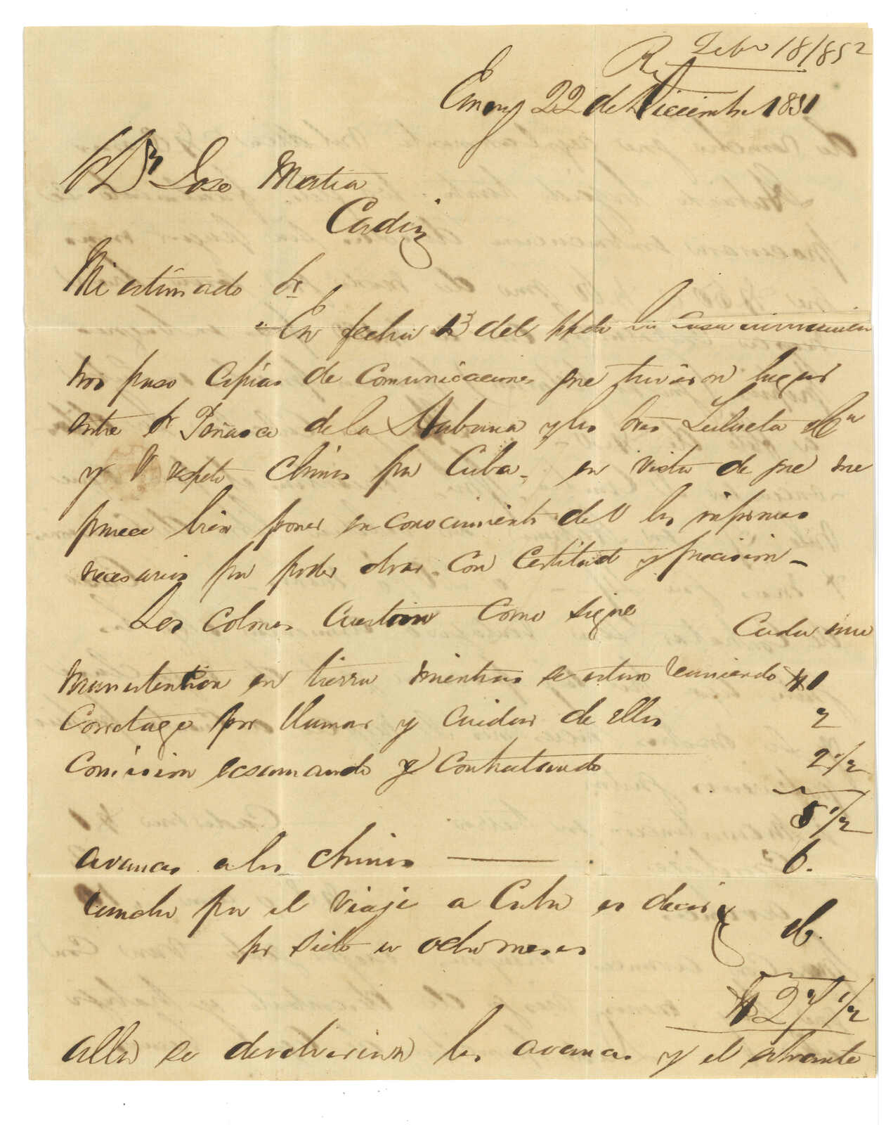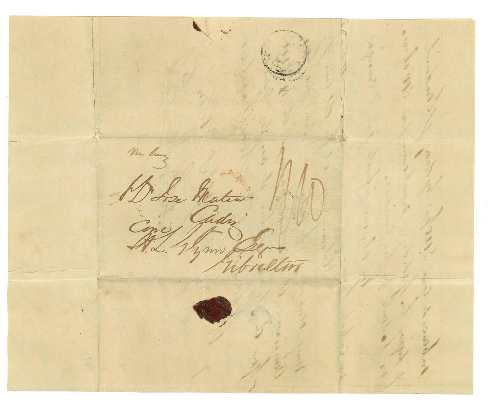2911 cover image1852 Amoy to Gibraltar. Entire letter, rated "1/10", applied with Webb type 8 "Paid at Hong Kong circular h.s. On reverse with another strike of faint Hong Kong cds. 1997 (30 Aug) John Bull, lot 683.