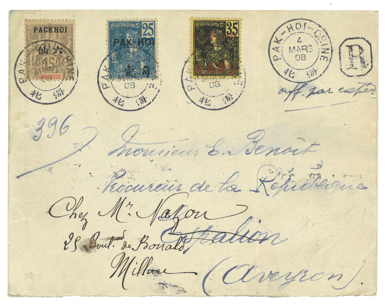 1906.3.4 北海寄法國。掛號封,貼航海及商貿神像及法蘭西像改值PACKHOI連中文面值票3枚,銷北海法局日戳,旁鈐R章。3.6經海防。4.14抵Averyron。封舌缺失。貼票漂亮。2012.4 Interasia,拍品號1489。(Image 1) (Image 2)