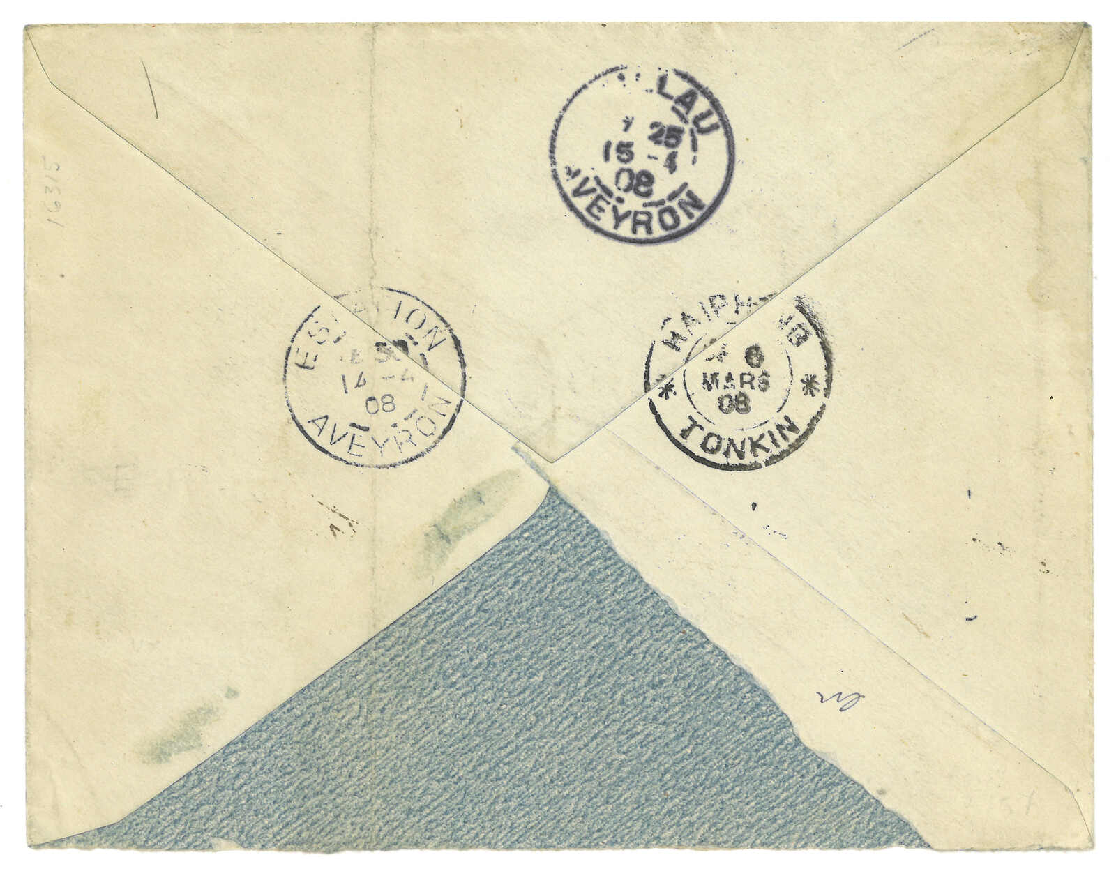 2935 cover image1906 Pakhoi (4 Mar) to France. Registered cover, f.w. Navigation and Commerce issue and France type surch Packhoi with Chinese value x3, tied by Packhoi Frencch PO cds, alongside with R mark. Transit Haiphong (6 Mar). Arrived Aveyron (14 Apr). Flap missing. Beautiful franking. 2012 (Apr) Interasia, lot 1489.