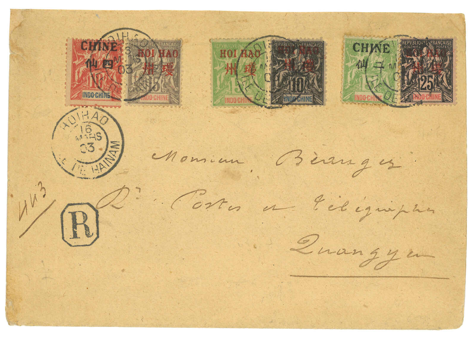 1903.3.16 海口寄法屬印支。掛號封,貼航海及商貿神像加蓋CHINE或HOIHAO連中文面值票6枚,當中一枚帶齒孔移位變異,銷海口法局日戳,旁鈐R章。3.19經海防。變異票實寄較少見。(Image 1) (Image 2)