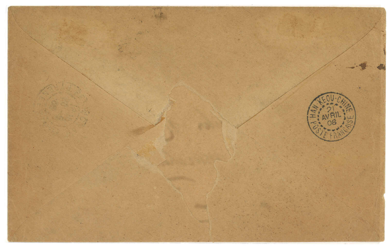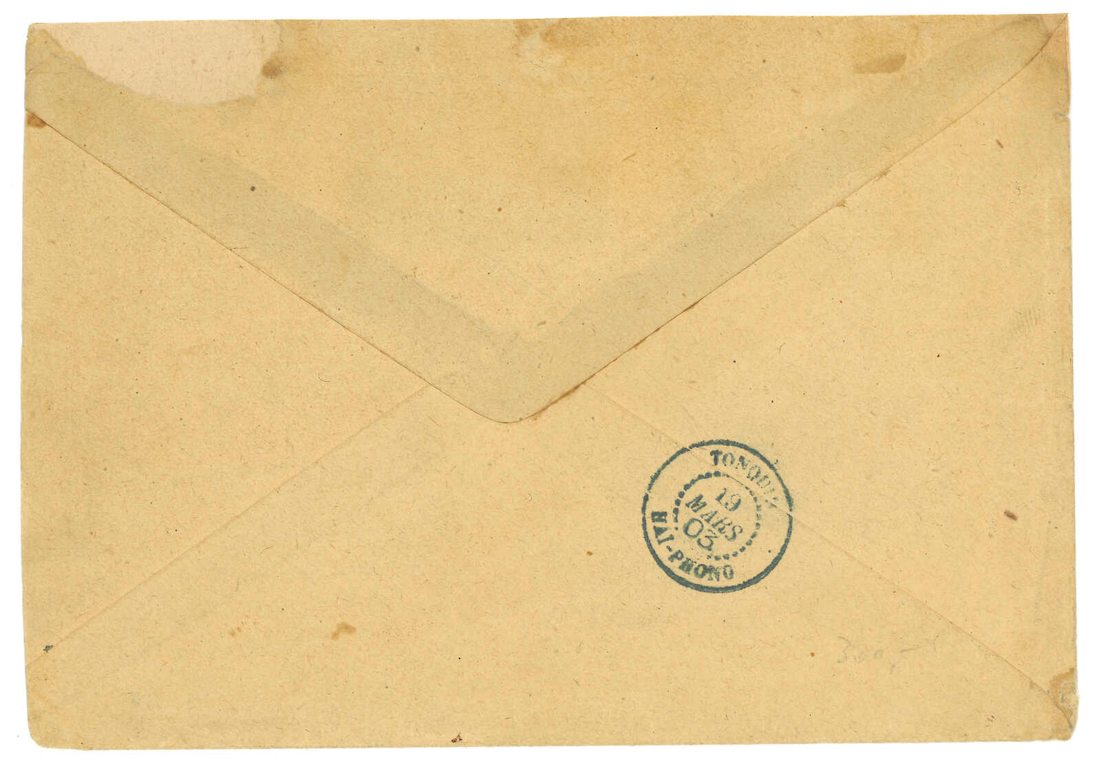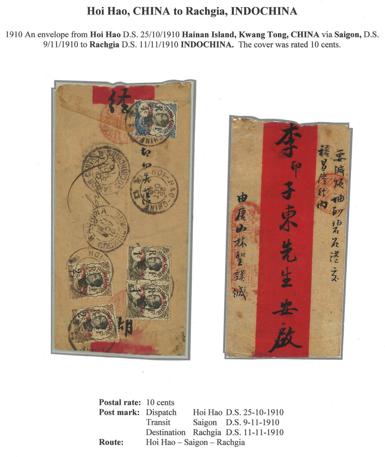1910.10.25 海口寄印支迪石。銀信紅條封,背貼土女圖 加蓋HOI HAO連中文面值5枚,銷海口法局日戳。11.9經西 貢。11.11抵迪石。封頂打開。(Image 1) (All Images)