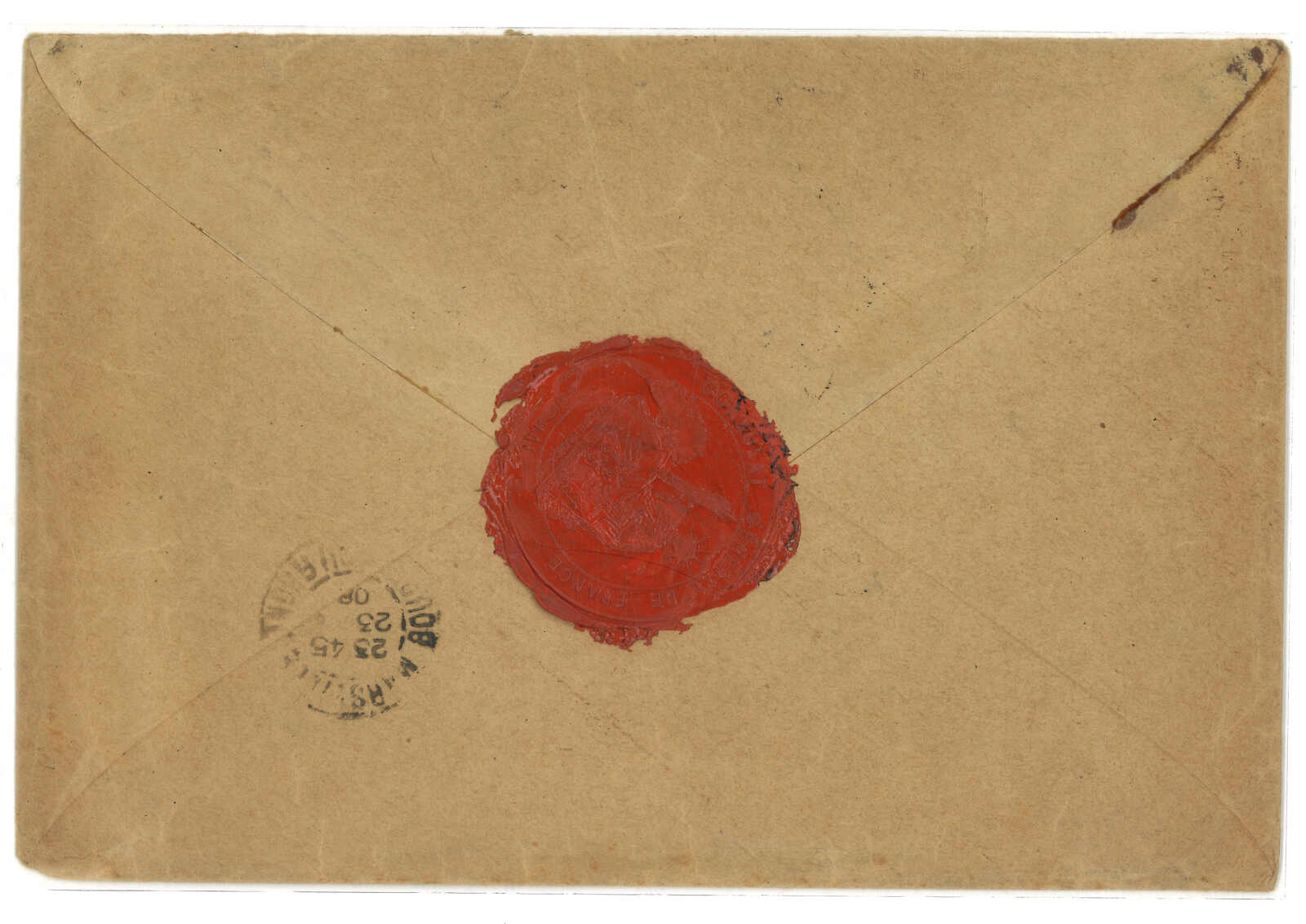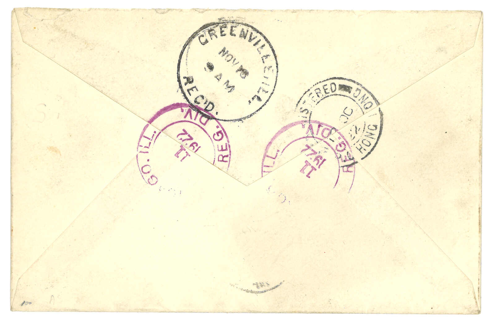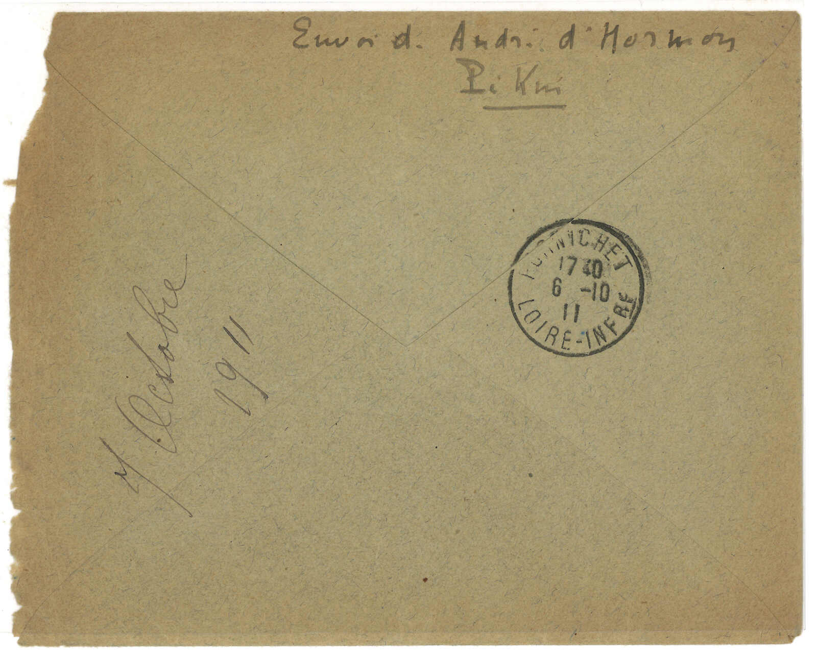 1910.10.25 海口寄印支迪石。銀信紅條封,背貼土女圖 加蓋HOI HAO連中文面值5枚,銷海口法局日戳。11.9經西 貢。11.11抵迪石。封頂打開。(Image 1) (All Images)