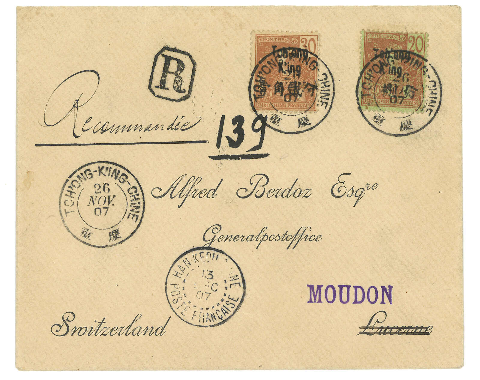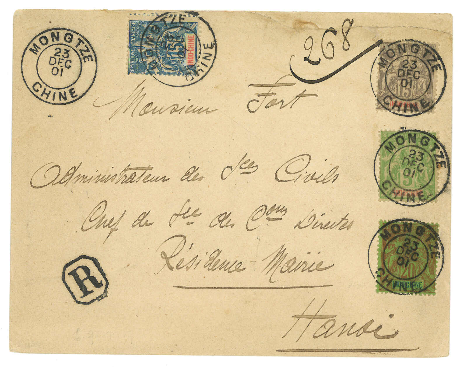 1901.12.23 蒙自寄河內。掛號封,貼航海及商貿神像票4枚,合55生丁,銷蒙自法局日戳,旁鈐R章。12.28經老街。1.6抵河內。2024年11月艾華秋拍曾出售一件1902年1月28日之蒙自寄巴黎封,稱可能為老街A法國客郵局正名為蒙自後之最早實寄封,然而此封更早。2012.4 Interasia,拍品號1489。(Image 1) (Image 2)