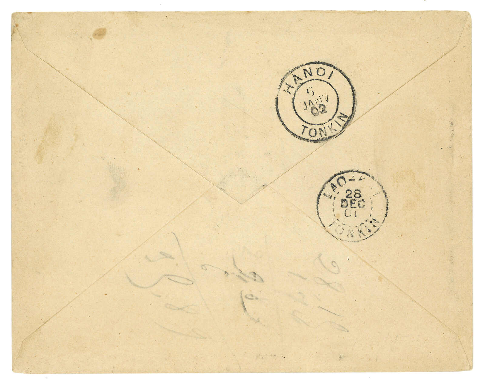 853 cover image1901 Mengtsz (23 Dec) to Hanoi. Registered cover, f.w. Navigation and Commerce issue x4, in total of 55c, tied by Mengtse (Mongtze) French PO cds, alongside with R mark. Transit Laokay (28 Dec). Arrived Hanoi (6 Jan). In 2024 (Nov), AVA Auctions offered a Mengtze to Paris cover, dated 28 Jan 1902 and claimed it is probably the earliest cover since the name of the post office was changed from Laokay A to Mongtze. This cover, however, is even earlier. 2012 (Apr) Interasia, lot 1489.