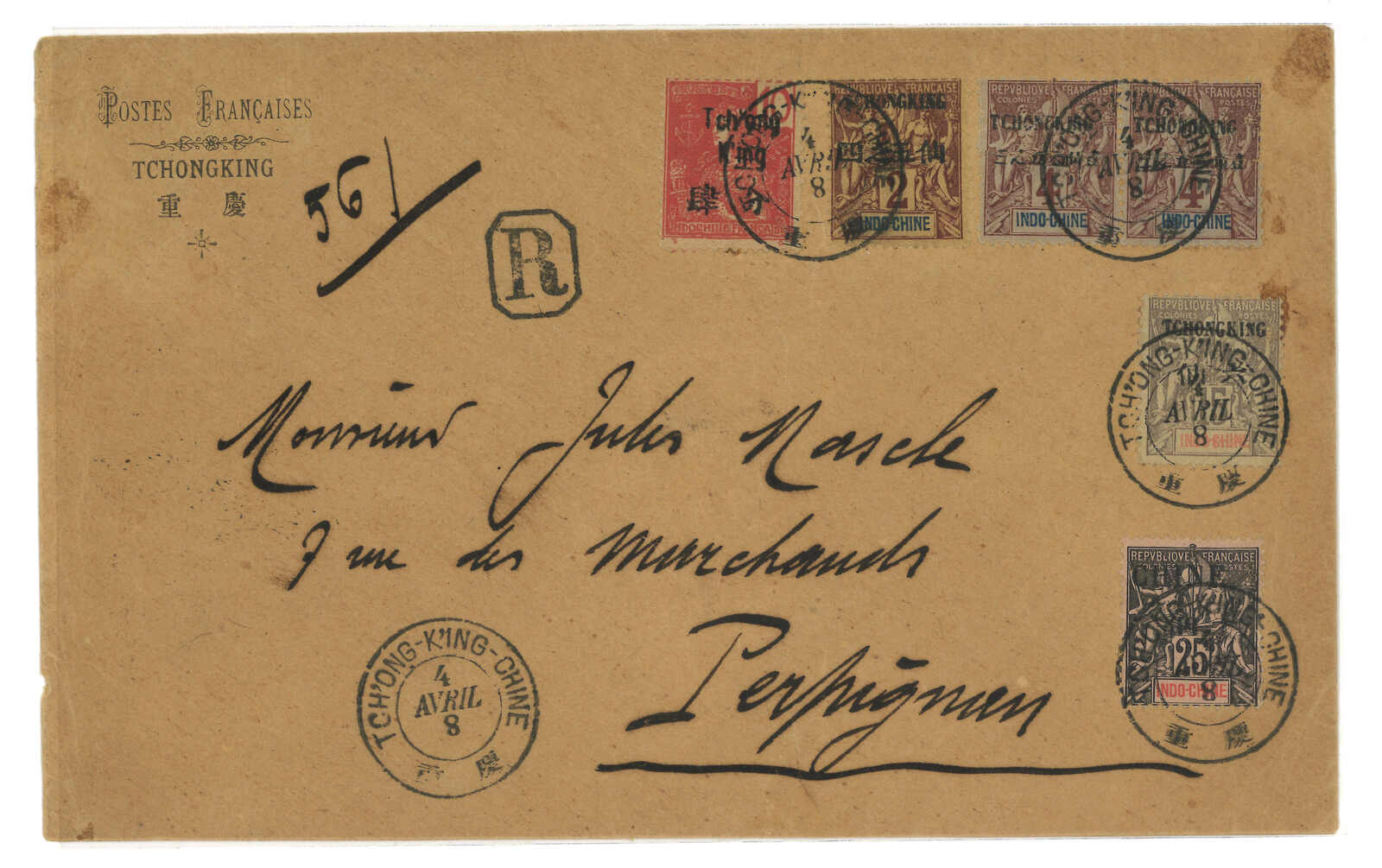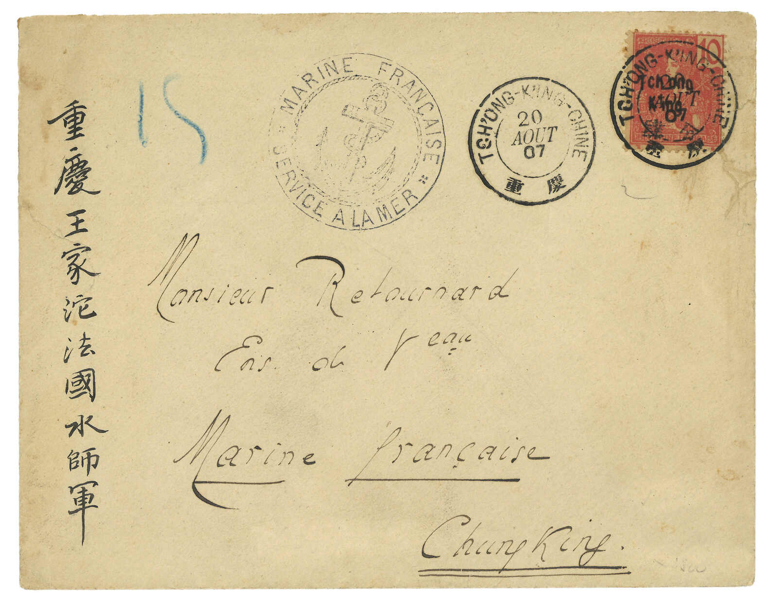 1907至1908年一組三件寄本埠及國外之重慶法國客郵局封,貼航海及商貿神像、法蘭西像加蓋Tchong / TCHONGKING連中文面值票,銷重慶法局日戳。當中一件寄本埠法國水師地址,鈐海軍陸戰隊圓戳。(Image 1) (Image 2) (Image 3) (Image 4) (Image 5)