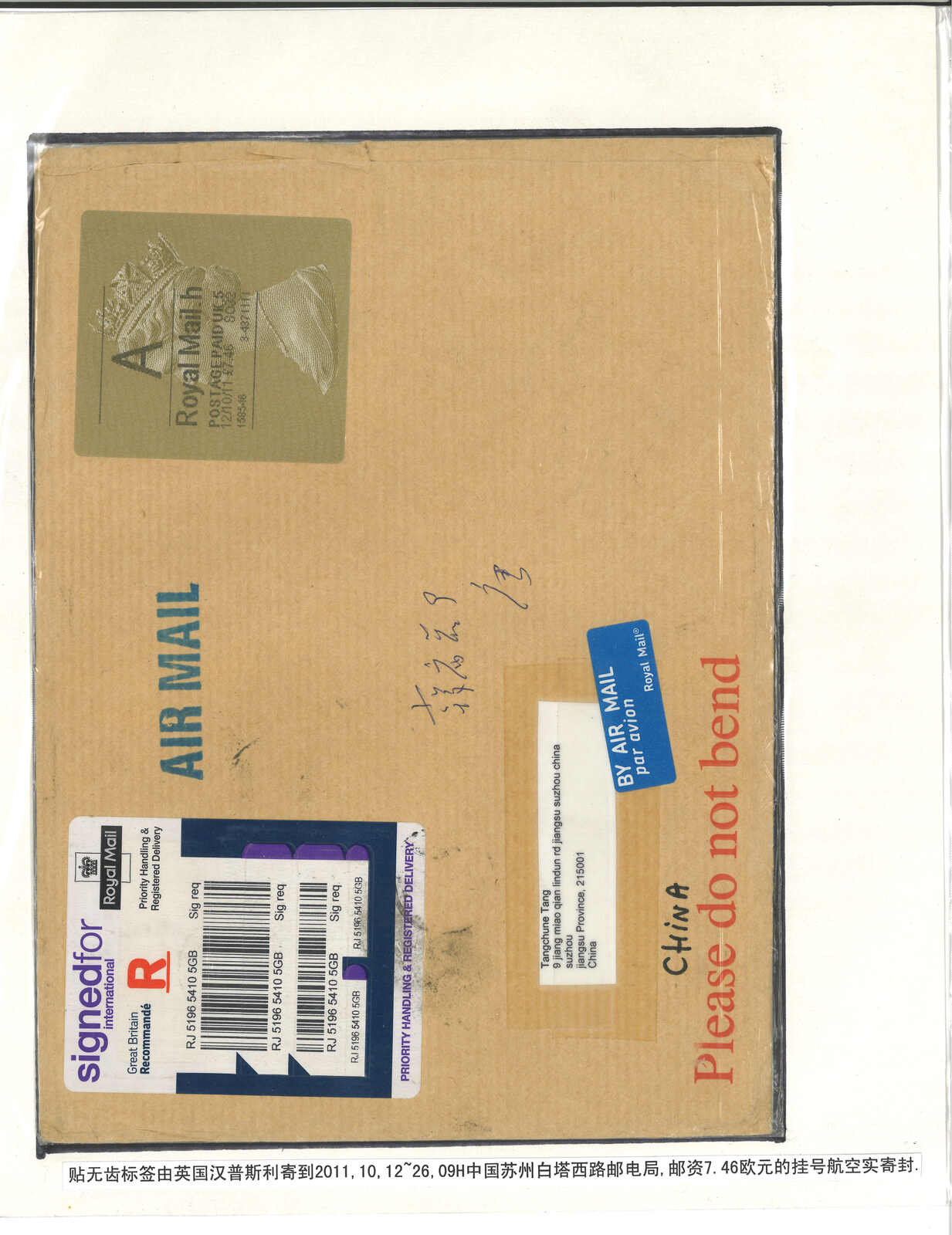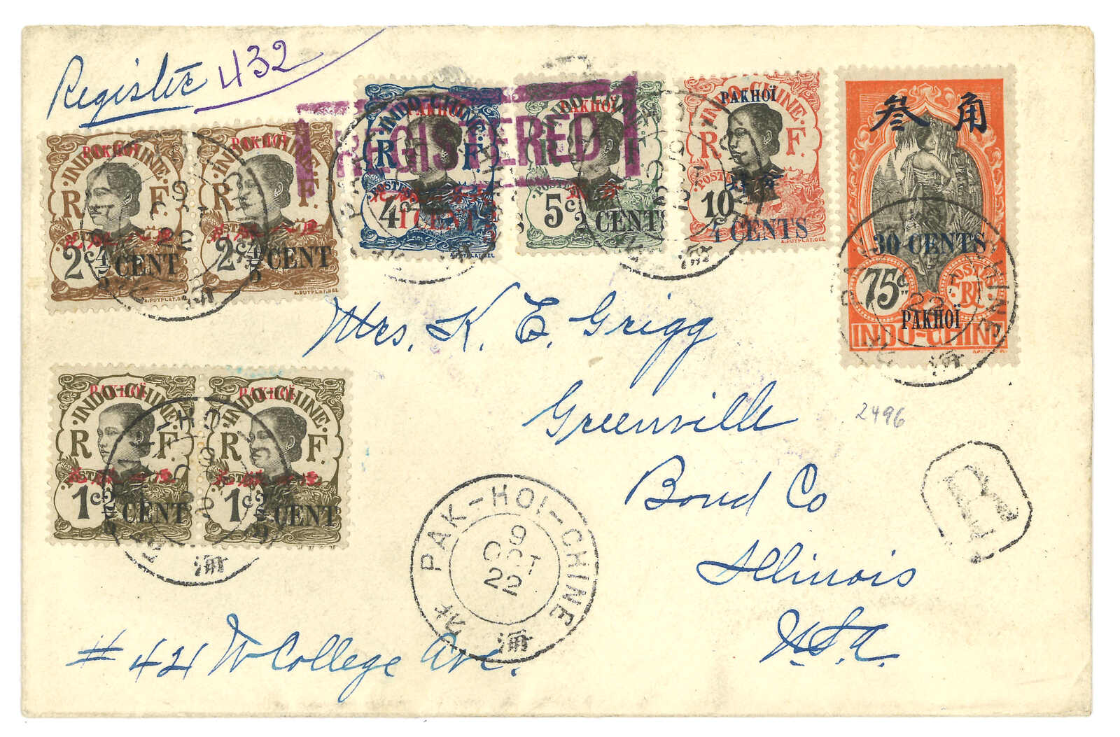 2936 cover image1922 Pakhoi (9 Oct) to USA. Registered cover, f.w. Native Girl surch Pakhoi with Chinese and French value x8, tied by Pakhoi French PO cds., alongside with R mark and registered mark. Transit Hong Kong (13 Oct). Arrived USA (18 Nov). Nice franking. 2008 (Jul) Zurich Asia, lot 723.