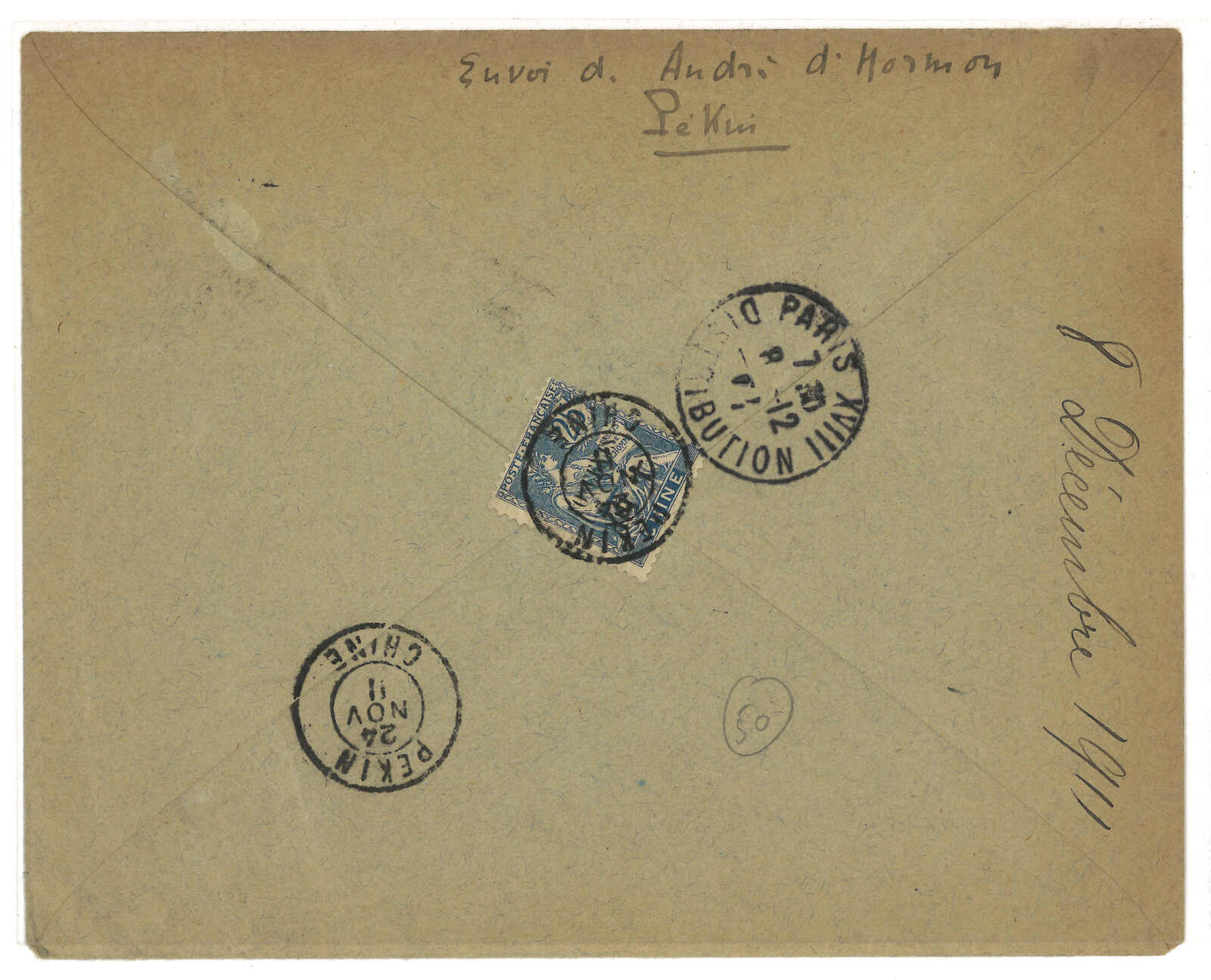 2938 cover image1910 (12 Dec) Detachement de Pekin, 16e Regiment d'Infanterie Coloniale, Corp's D'Occuoation Chine cover to France, f.w. regular issue surch small figure 4c, tied by Peking French Military PO cds.