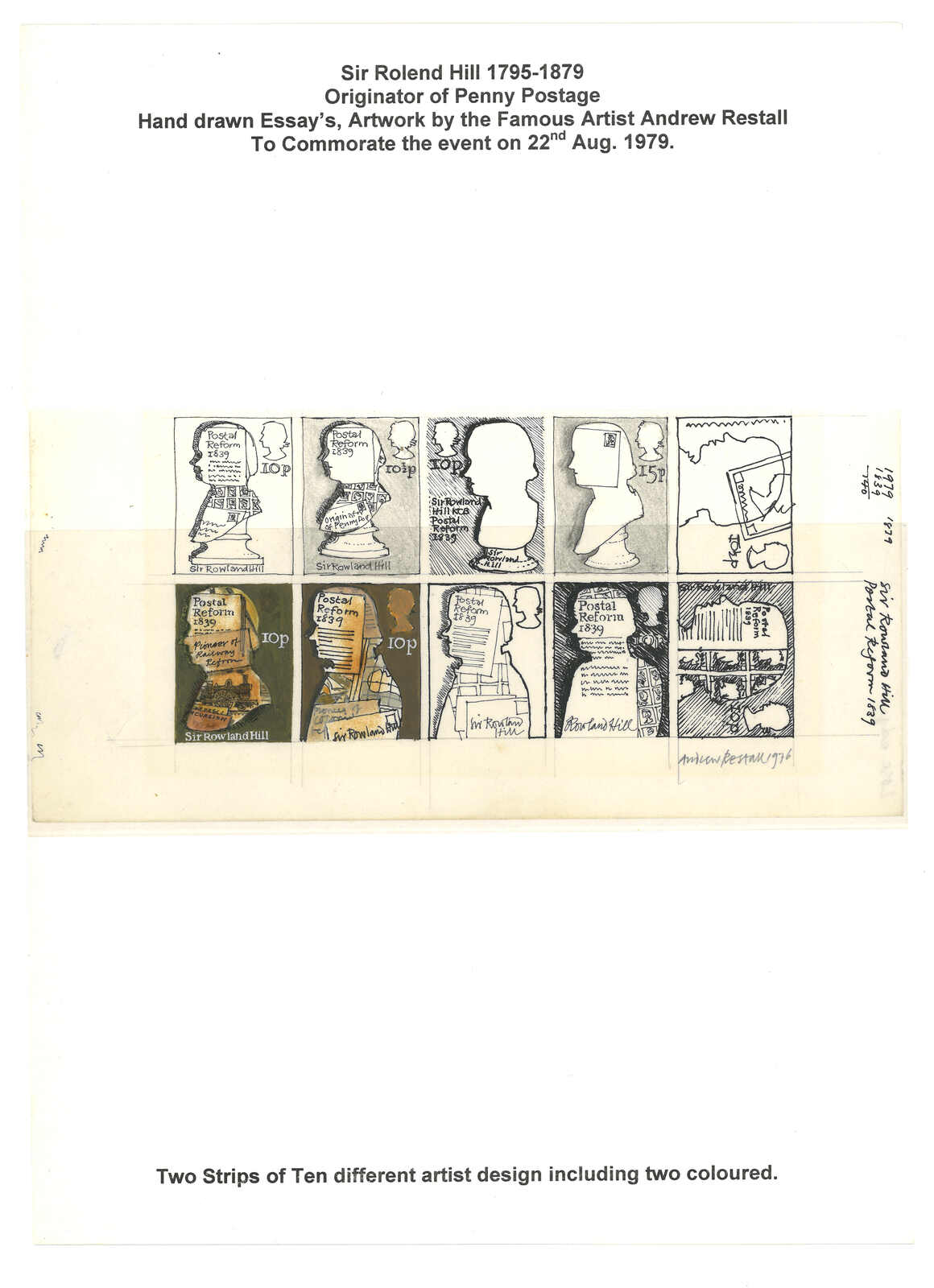 1979年一組五件英國“羅蘭希爾百週年”手繪設計稿橫連,由設計師Andrew Restall繪畫。羅蘭希爾為現代郵政系統之創辦人兼為黑便士之設計師。有趣。(Image 1) (Image 2) (Image 3)