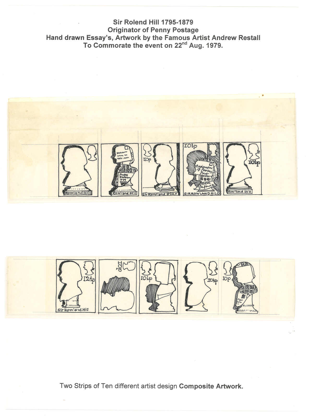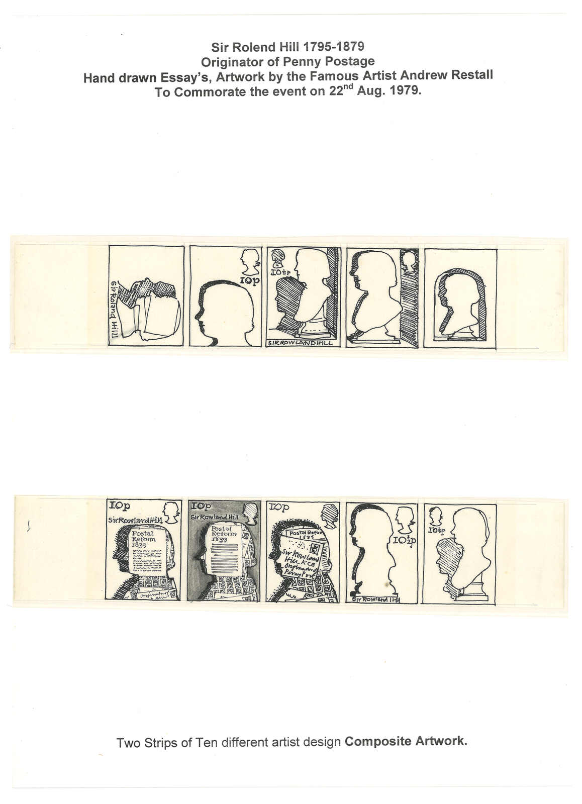 452 image1979 a group of 5 hand drawn essay strip of Britain "Rowlend Hill Centenary" issue, by artist Andrew Restall. Sir Rowlend Hill was the founder of modern postal system as well as the designer of Penny Black. Interessting.