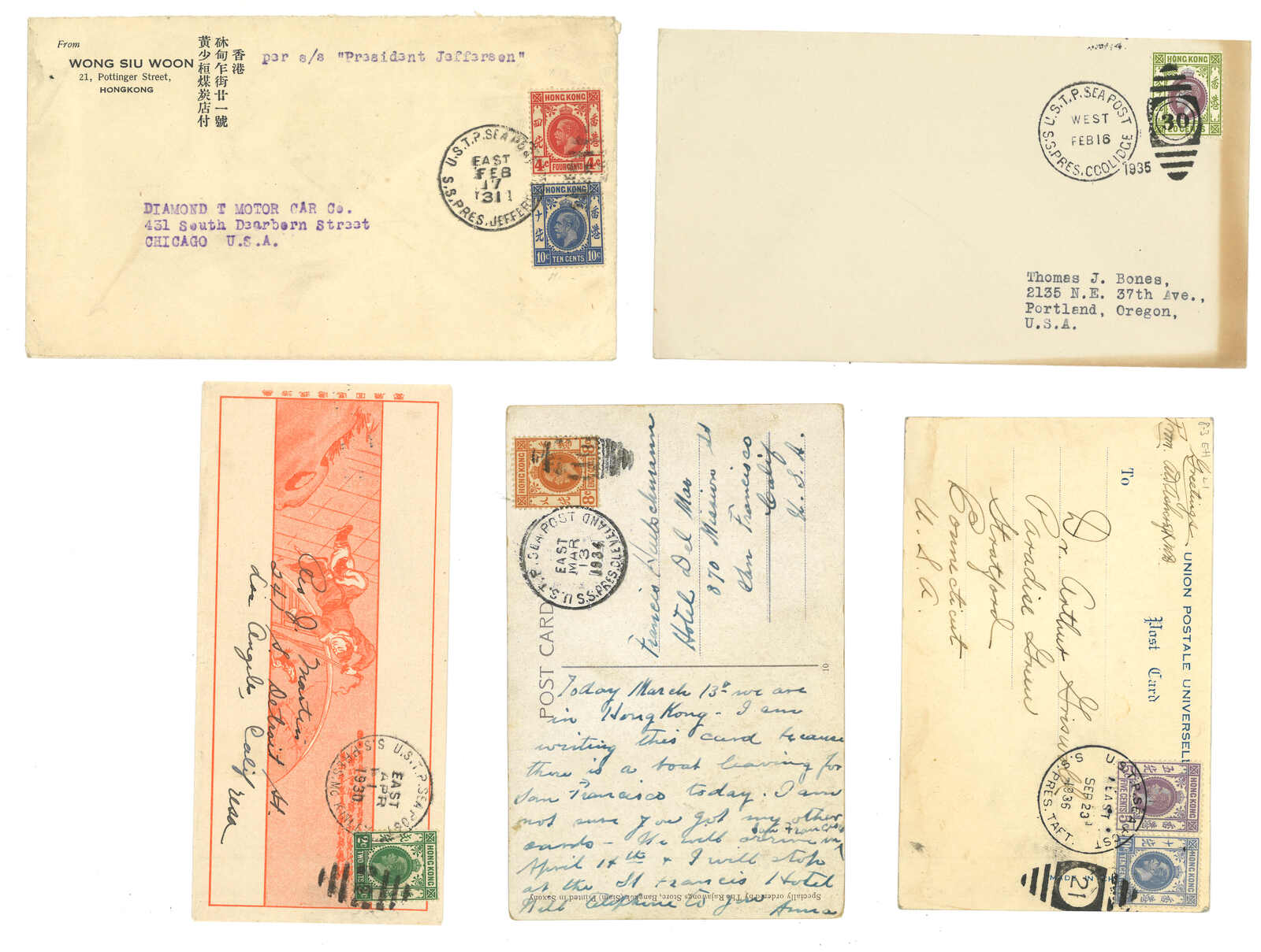 1930s a gourp of 5 USTP Sea Post covers and postcard, alll f.w. Hong Kong KGV issues, tied by SS President Jefferson, Coolidge, Taft, Cleverland duplex d.s. etc. In 1922 and 1924, Admiral Oriental Line and Dollar Line began US