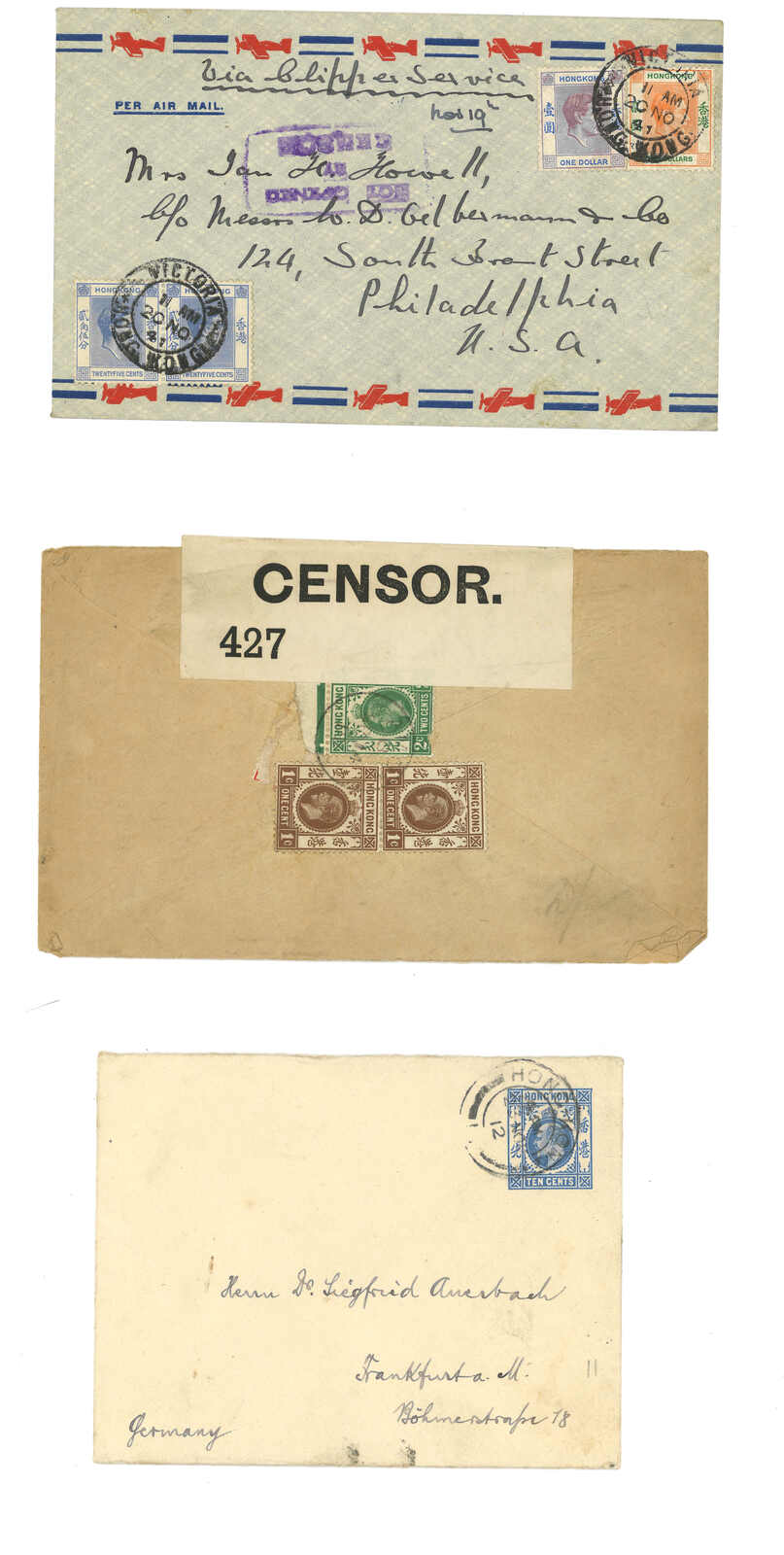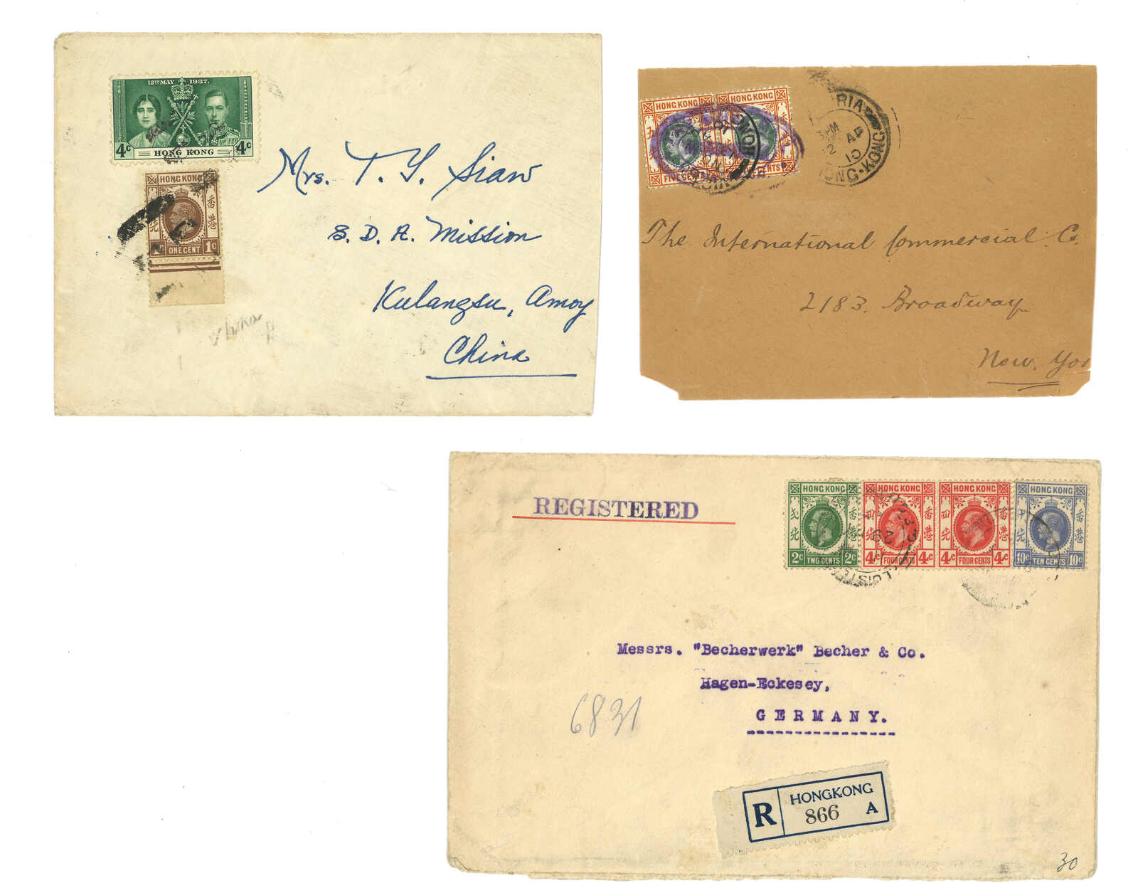 1910-1930s a group of 3 outgoing covers from Hong Kong, f.w. Hong Kong KEVII, KGV and Coronation issues. Showcasing The China Mail oval seal and other features.