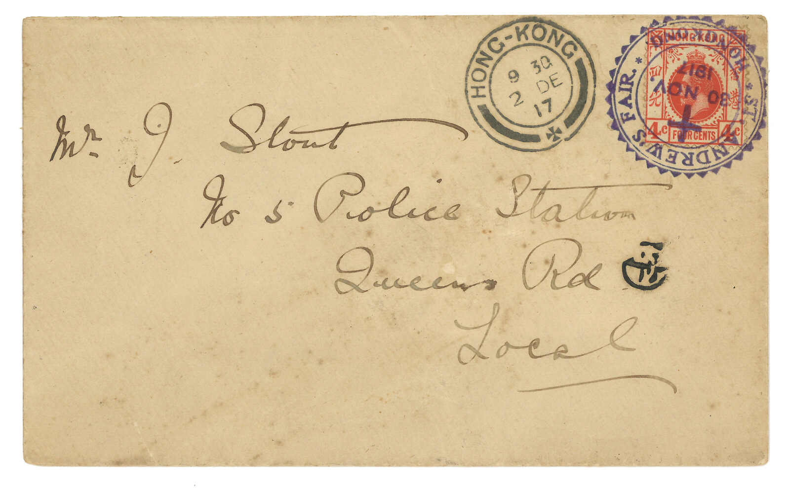 1917 (30 Nov) Hong Kong local, f.w. Hong Kong KGV 4c, tied by scarce “St Anderw’s Fair” commemorative cds., alongside with Hong Kong (2 Dec) arrival cds. This fair was organized and held in St Andrew’s Church, Kowloon by the