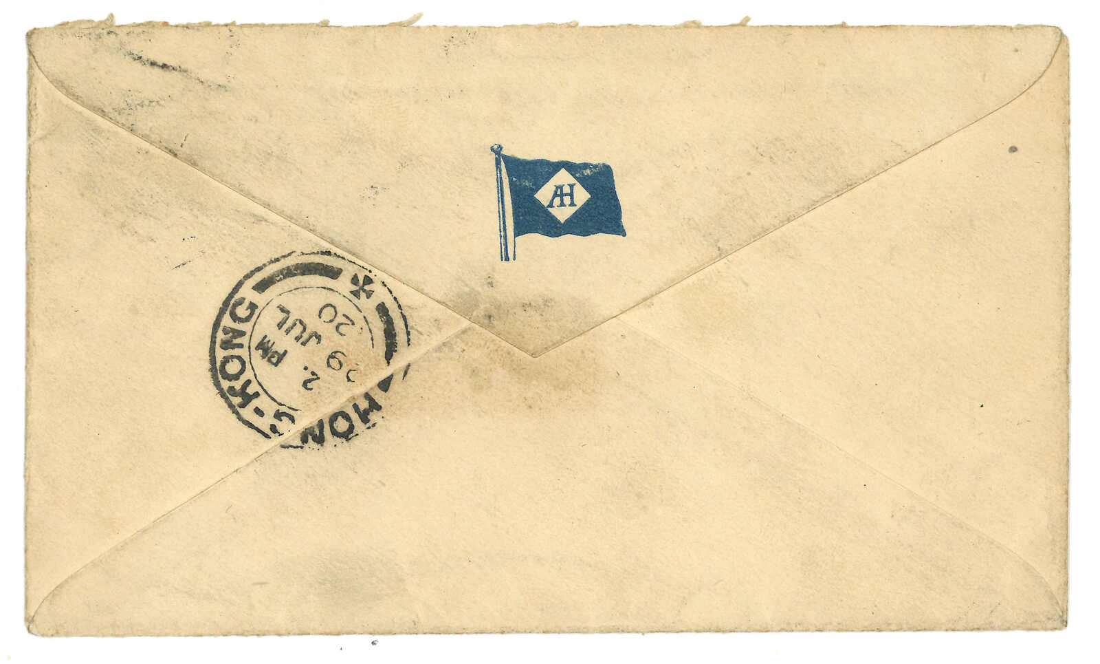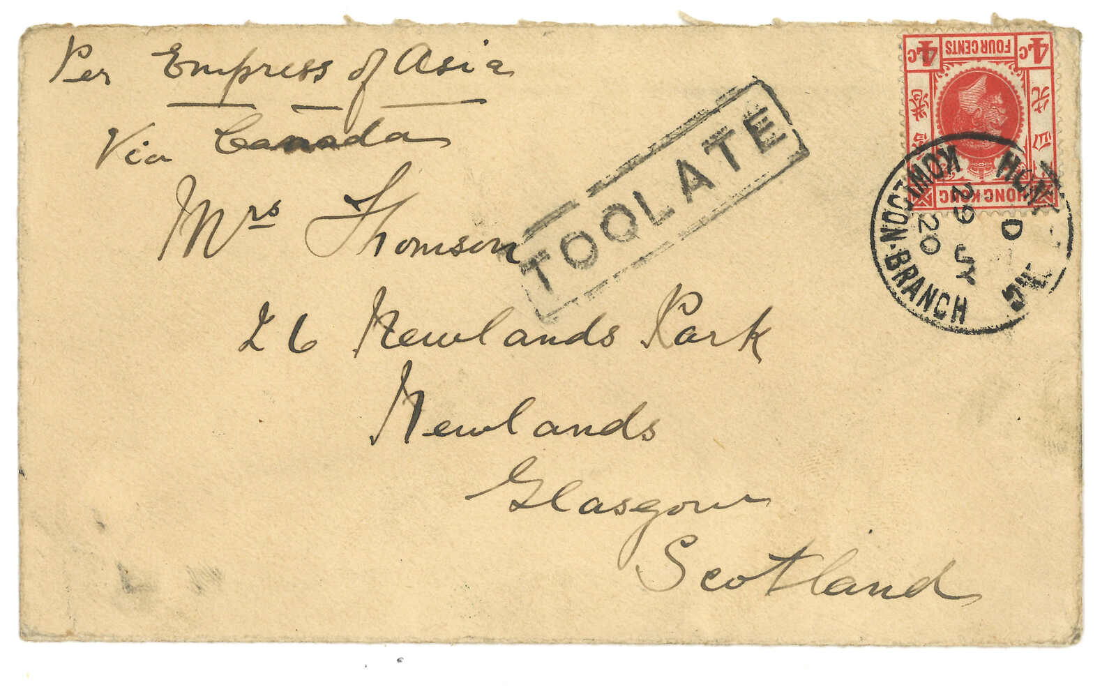 1920 Hong Kong (29 Jul) to Scotland, sent “Per Empress of Asia via Canada”, f.w. Hong Kong KGV 4c, tied by Kowloon Branch Webb type C cds., alongside with framed “TOO LATE” cachet. On reverse with Hong Kong (29 Jul) cds. Very