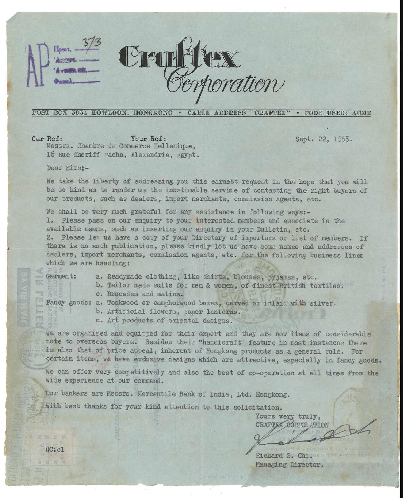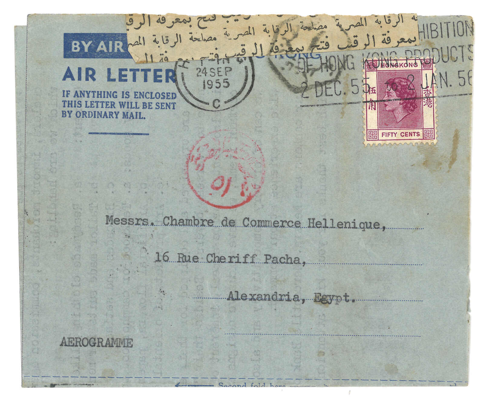 1955 (24 Sep) Hong Kong air letter to Egypt. f.w. QEII 1st issue 50c, tied by Exhibition of Hong Kong Products slogan meter stamp. Censored and resealed by Egyptian censor label. Arrived Cairo (27 Sep).