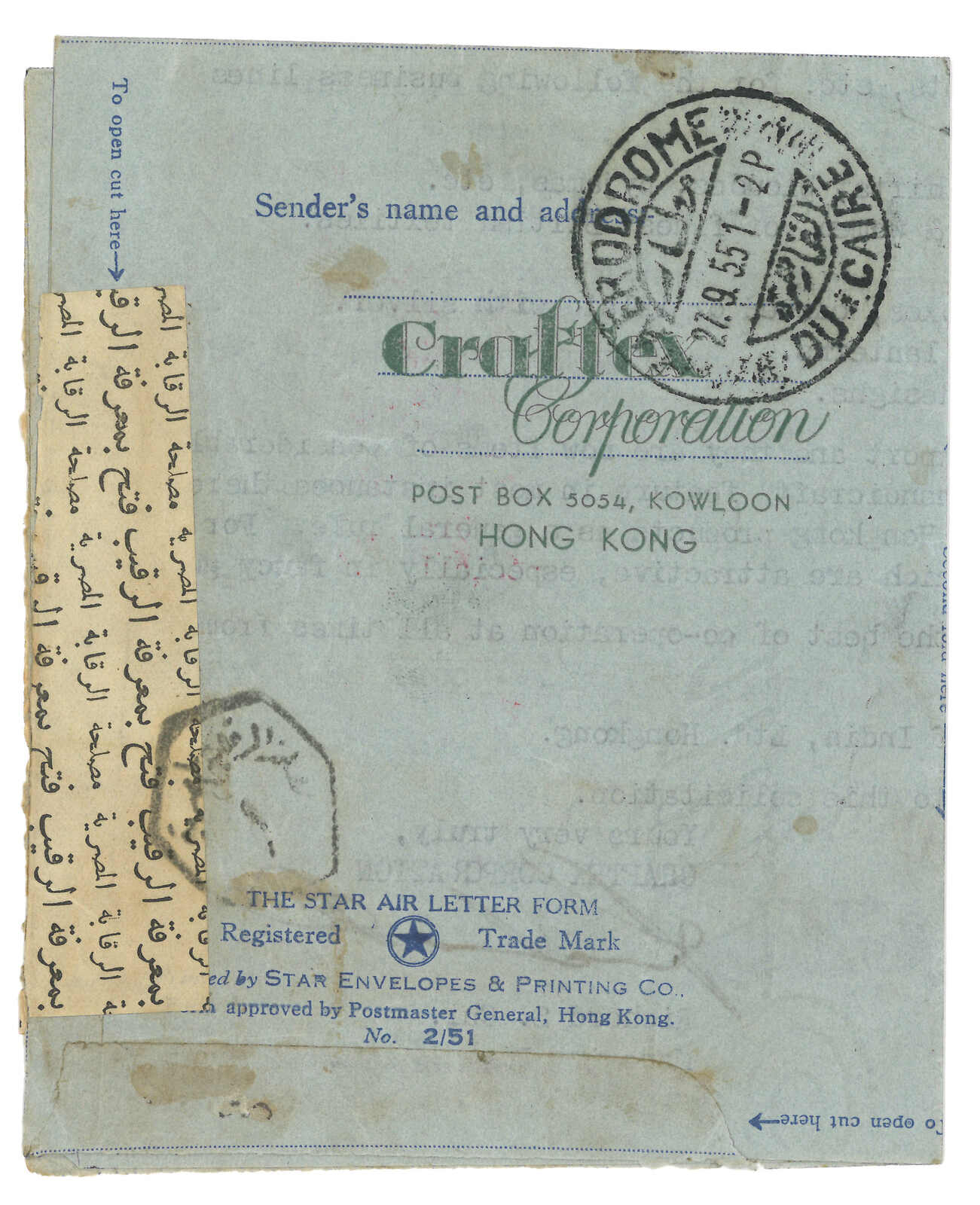 香港航空郵簡寄埃及,貼香港伊麗莎白二世第一版5角,銷香港工展會宣傳機戳。於埃及檢查重封。9.27抵開羅。(Image 1)