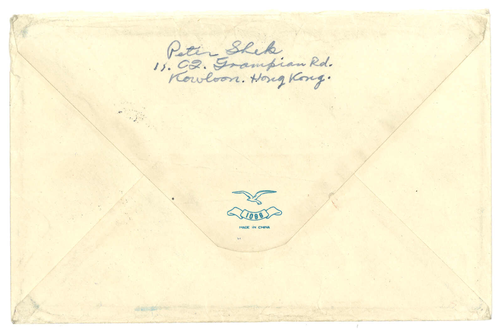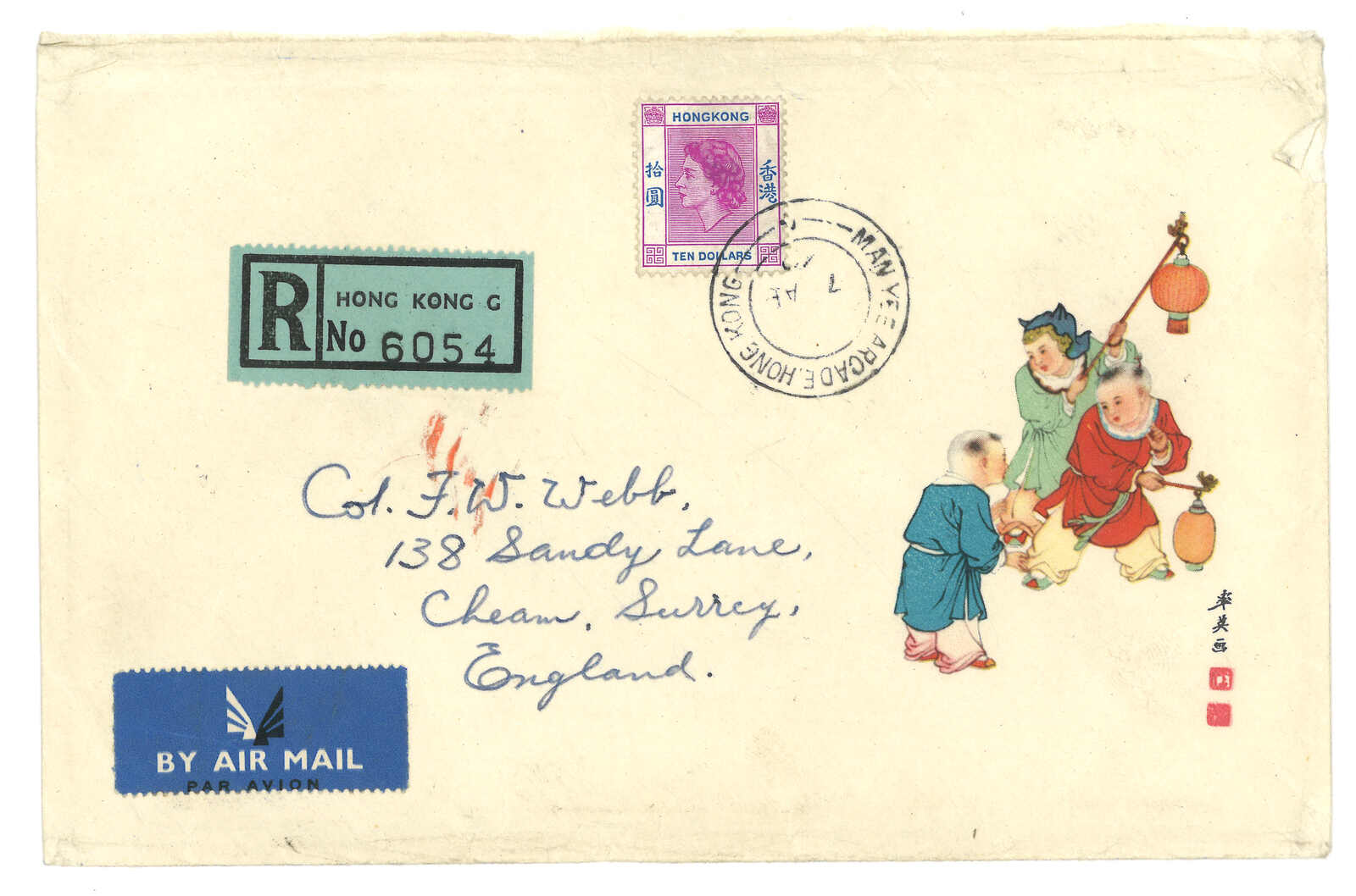 香港寄英國。航空掛號封,貼香港伊麗莎白二世第一版10元(楊目182),銷萬宜大廈商場日戳。少見之最高面值票貼用例子。(Image 1)