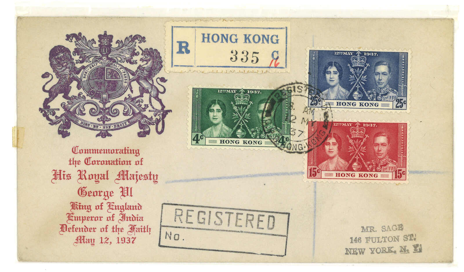 1910至1930年代一組三件香港寄國外及中國大陸封,貼愛德華七世、佐治五世及佐治六世加冕票,展示了The