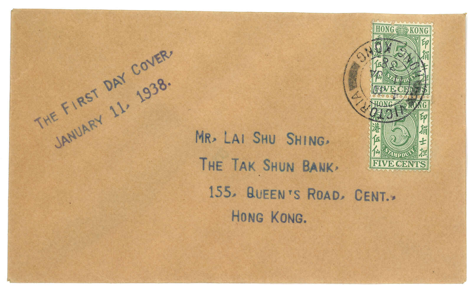 香港印花稅票改作郵票第四組5仙首日封各一件(楊目F12),分別銷香港總局掛號日戳及維多利亞日戳。(Image 1)