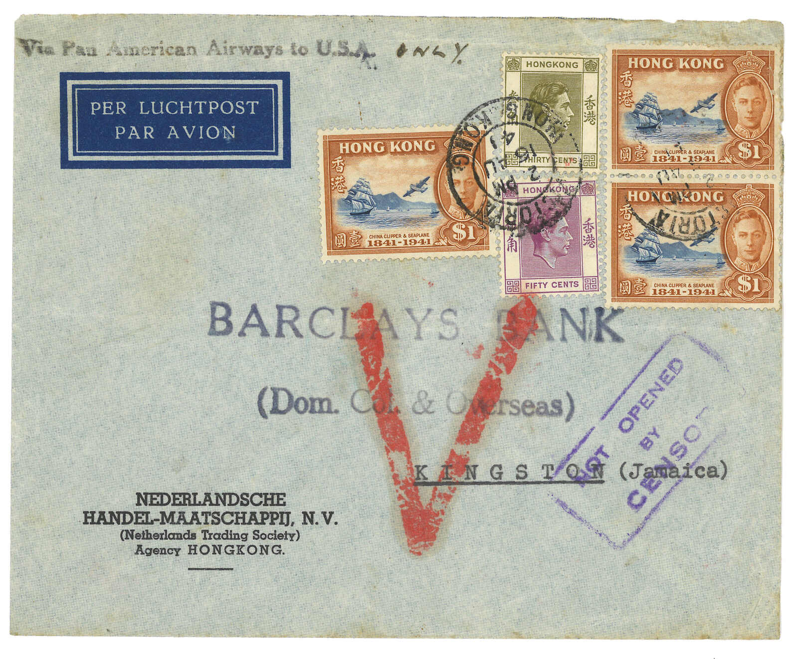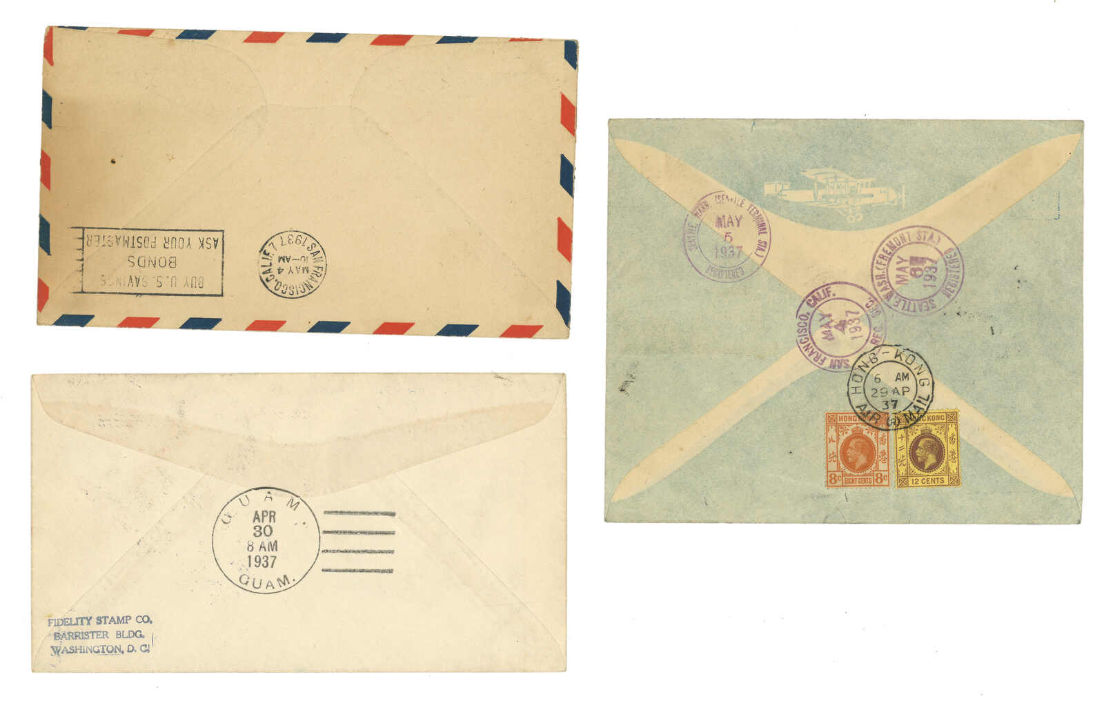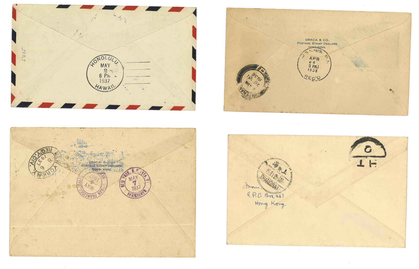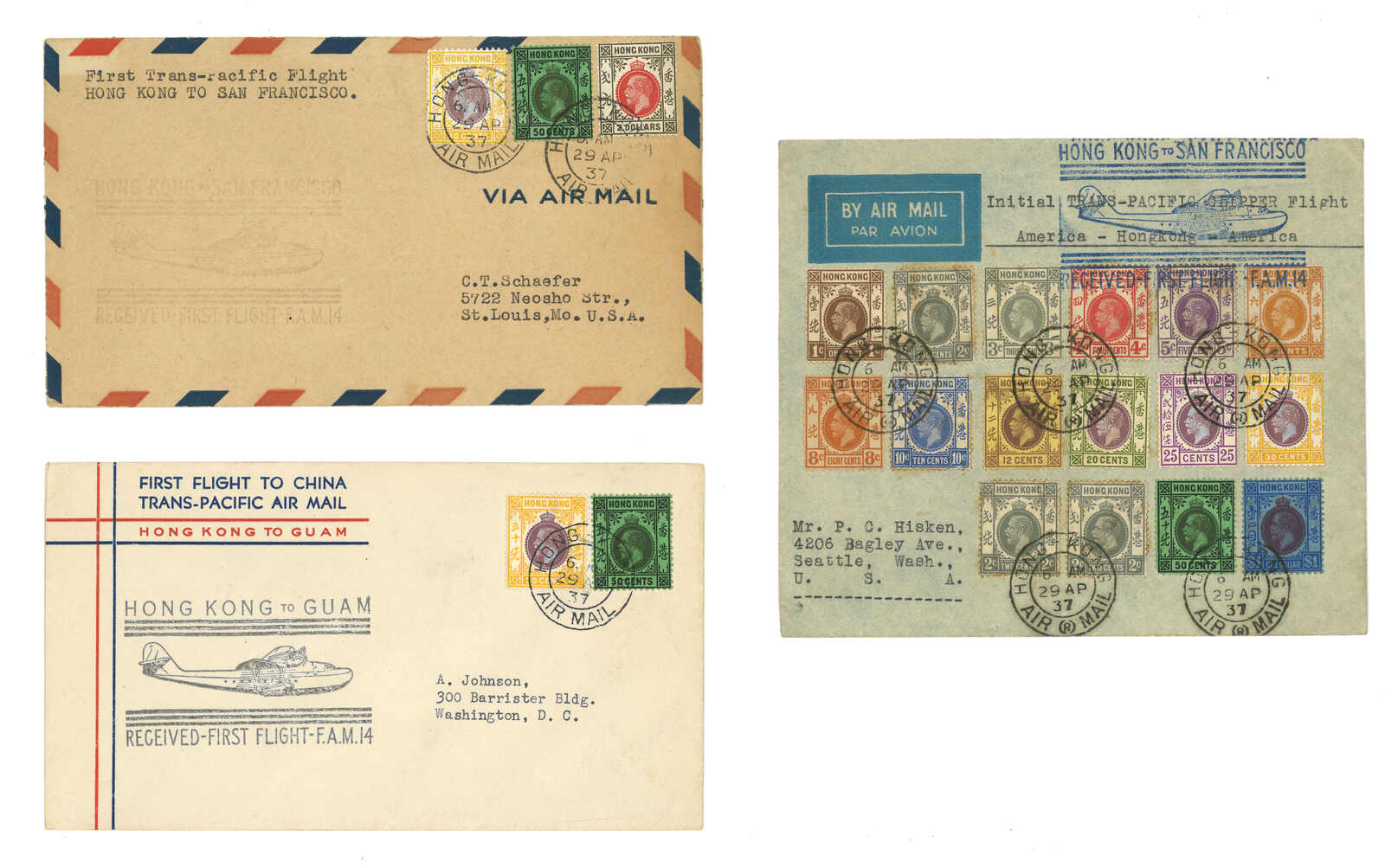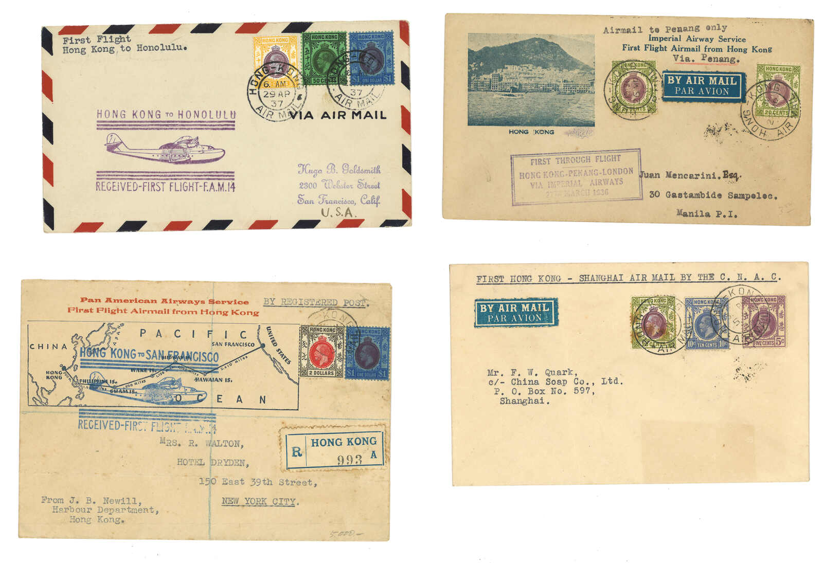 1936-1937 a group of 7 Hong Kong FFCs, including 1936 (27 Mar) Imperial Airway Service Hong Kong-Penang-London, 1936 (5 Nov) CNAC Hong Kong-Shanghai, 1937 (29 Apr) Pan-American Airways Hong Kong-USA FFC.
