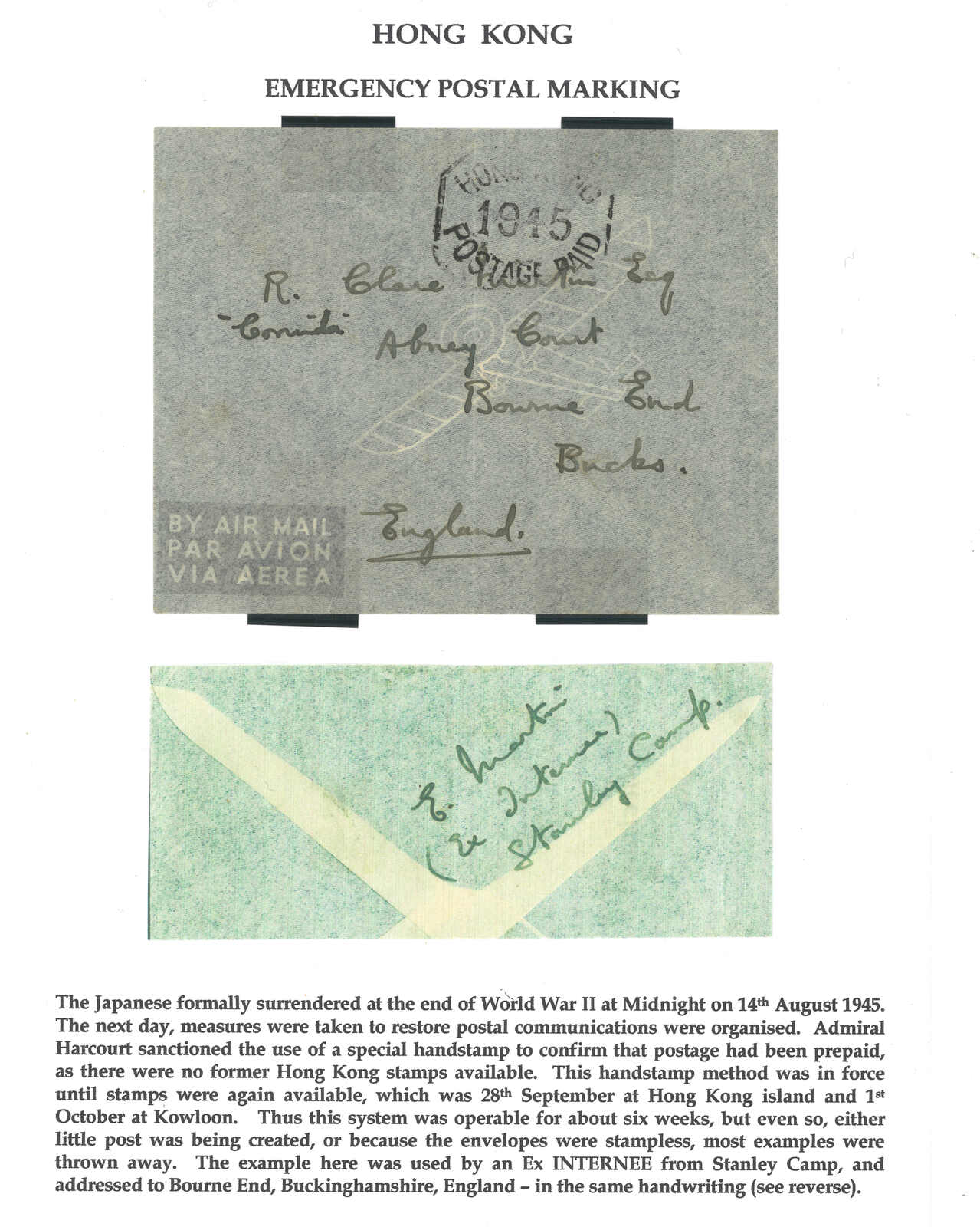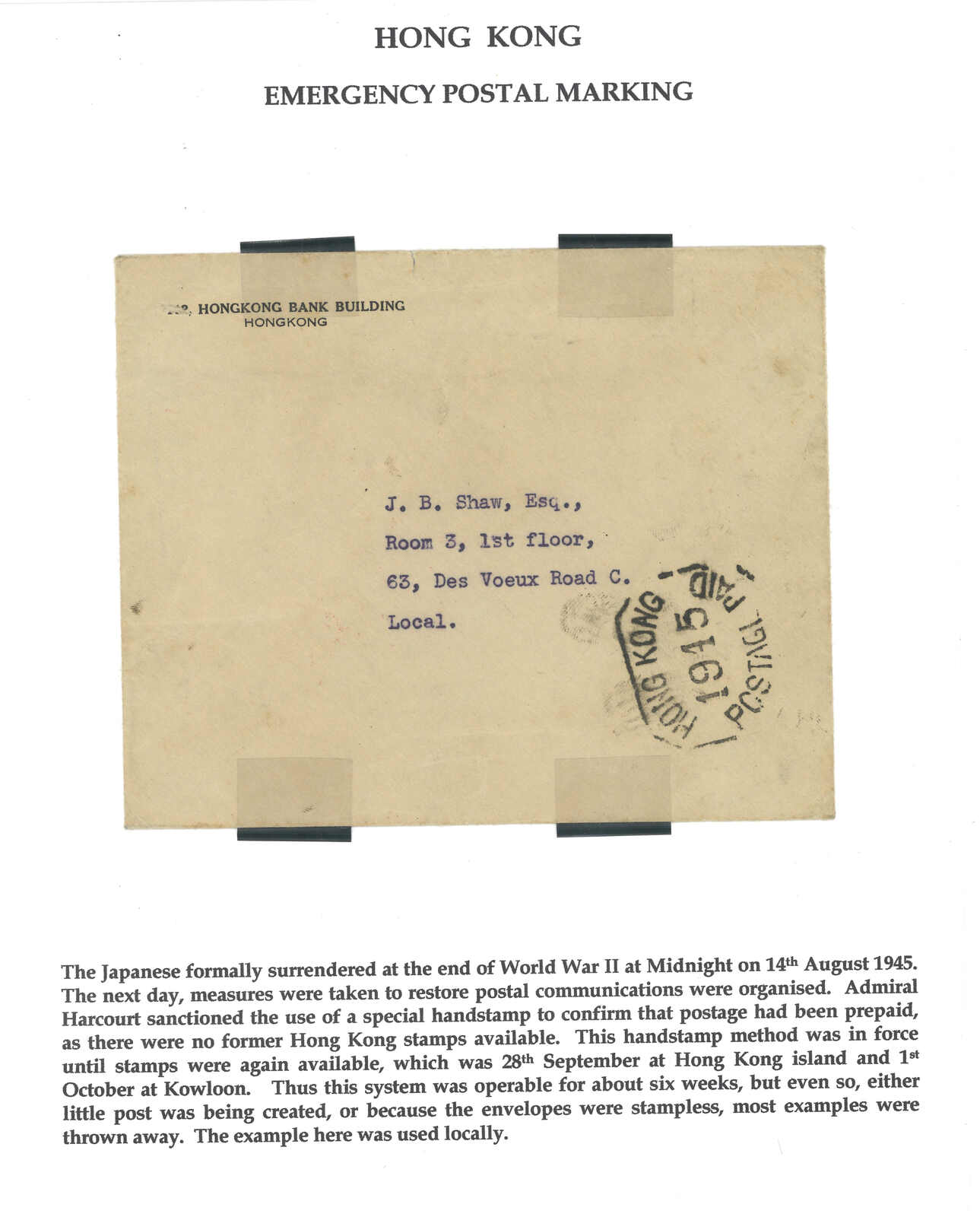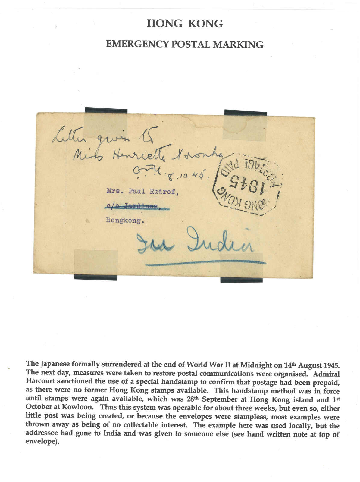 several posta-WWII covers applied with scarce Webb type V “HONG KONG / 1945 / POSTAGE PAID” h.s.