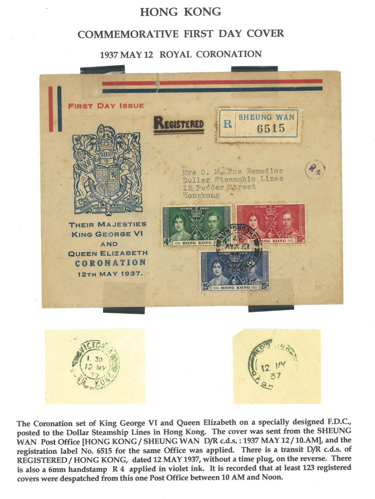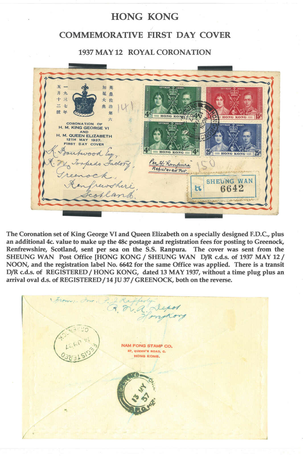 1937 (12 May) KGVI Coronation issue and 1938 (11 Jan) Hong Kong postal fiscal 4th series FDC each (Yang C6-8, F12), tied by Registered Hong Kong GPO and Victoria cds respectively.